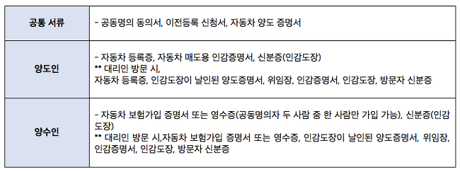 - 양도인(파는 사람) : 인감증명서, 자동차등록증