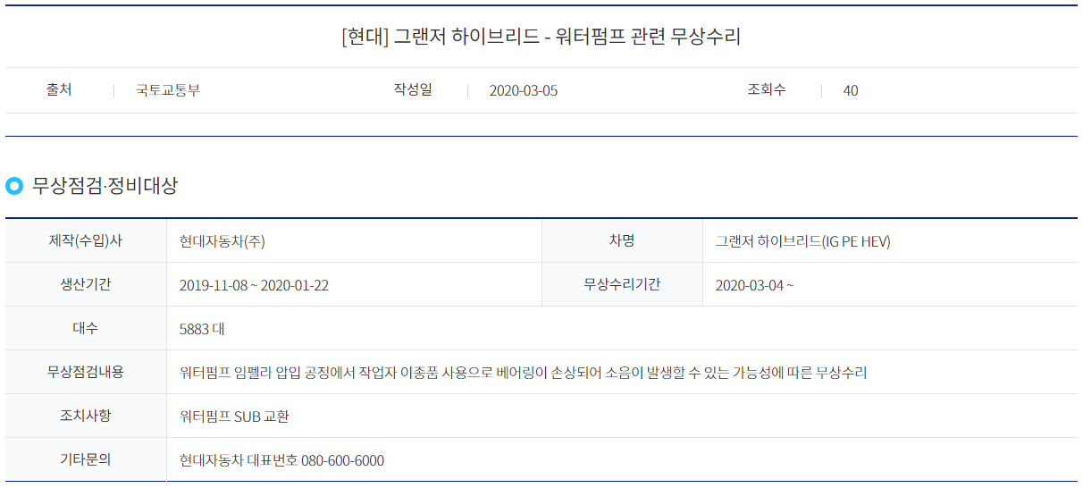 [현대]그랜저 하이브리드 - 워터펌프 관련 무상수리