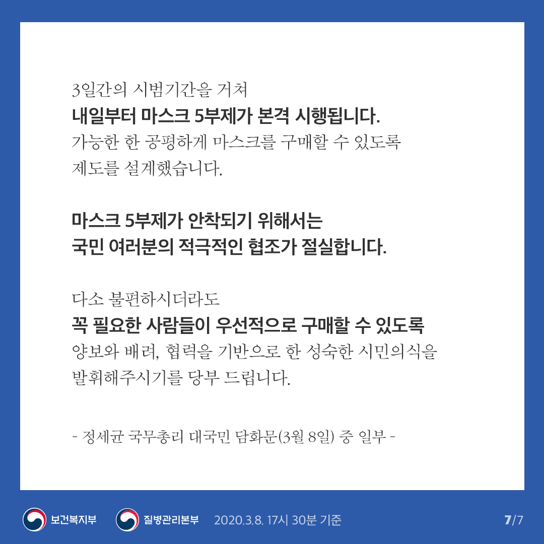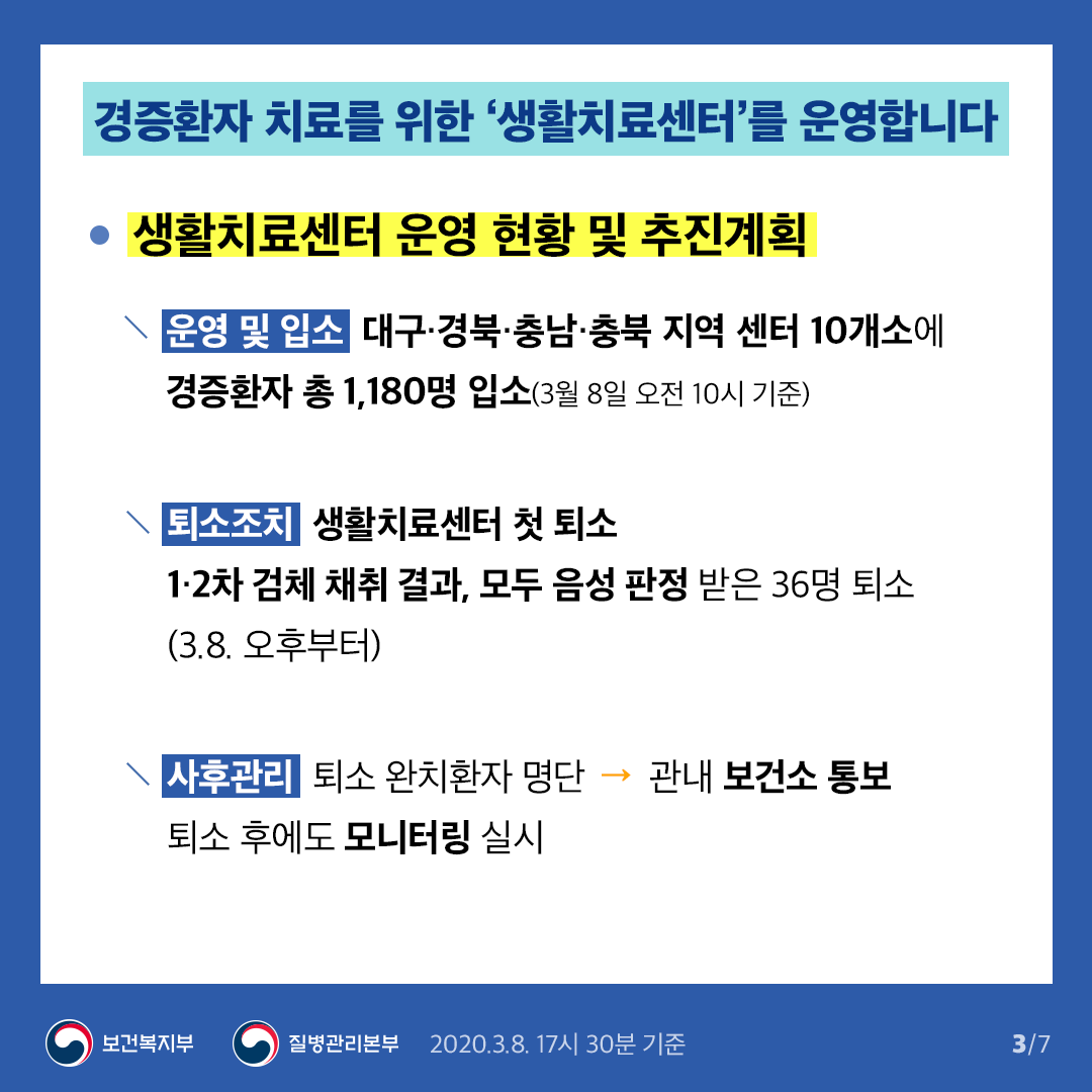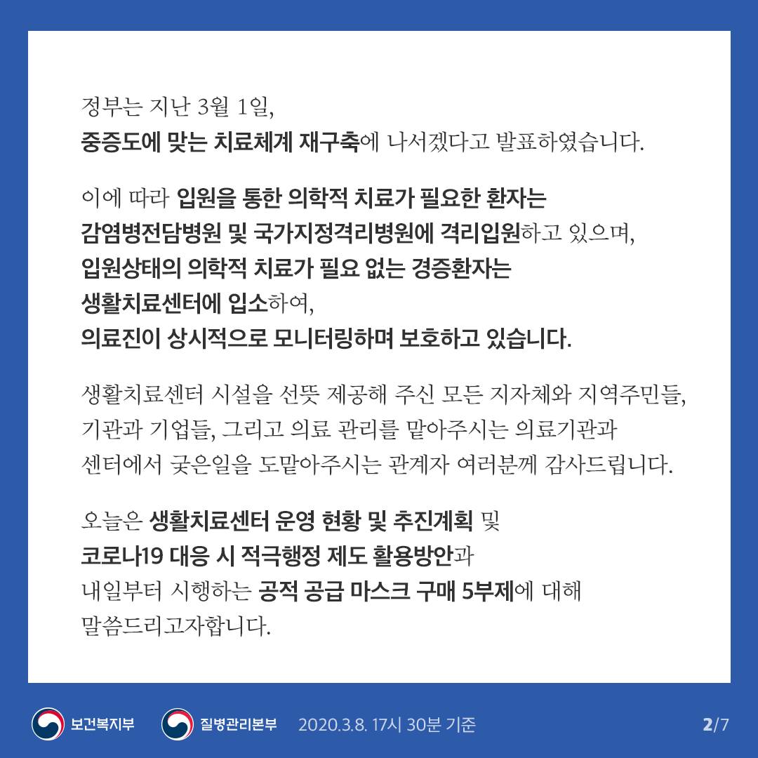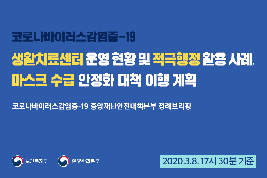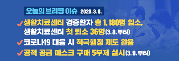 중앙재난안전대책본부 정례브리핑(3.8.), 생활치료센터 입소 및 퇴소 현황, 공적 공급 마스크 구매 5부제 실시(3.9.부터)