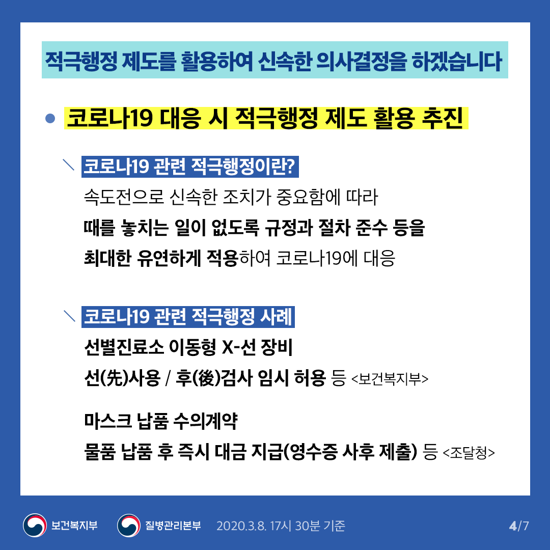 코로나바이러스감염증-19 정식 홈페이지로 발생현황, 확진환자 이동경로, 대상별 유의사항, 홍보자료, FAQ, 관련기관(보건소, 선별진료소 찾기), 정부 브리핑, 대응지침 등 안내
