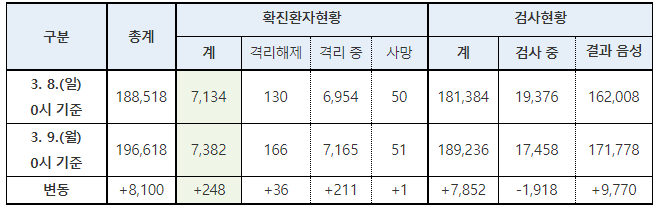 □ 질병관리본부 중앙방역대책본부(본부장 정은경)는 3월 9일 0시 현재, 총 누적 확진자수는 7,382명이며, 이 중 166명이 격리해제 되었다고 밝혔다.