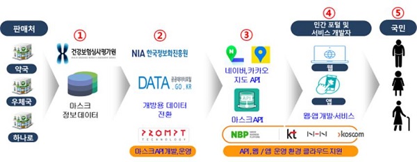심평원은 판매처, 판매현황 등 데이터를 정보화진흥원에 제공하고, 정보화진흥원은 제공받은 데이터를 약국 주소 결합 등 데이터를 재가공해 네이버 클라우드를 통해 오픈API 방식으로 제공한다.