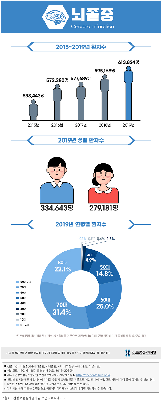 건강보험심사평가원 통계자료에 따르면 뇌졸중으로 진료를 받은 환자의 수는 2015년 53만 8443명에서 2019년까지 꾸준히 증가해 61만 3824명이 되었습니다. 2019년의 경우 연령별 환자의 수는 70대가 31.4%로 가장 많았고, 60대가 25%, 80대가 22.1%로 높았는데요. 60대 이상의 환자 수가 전체 환자 수의 78.5%를 차지할 만큼 많았습니다.