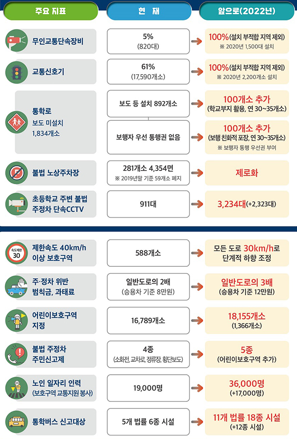 이를 위해 2022년까지 전국 어린이 보호구역에 무인교통단속장비와 신호등 설치를 완료하고, 운전자와 보행자의 시야를 가리는 불법 노상주차장은 올해 말까지 모두 폐지한다.