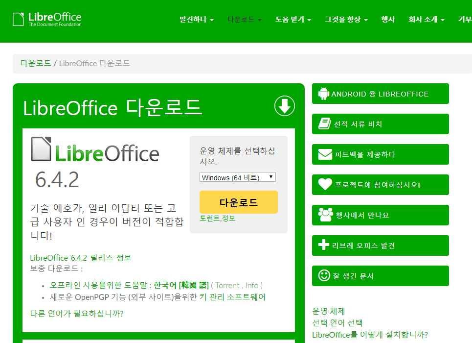 리브레오피스 공식 사이트 접속 ▶ https://www.libreoffice.org/