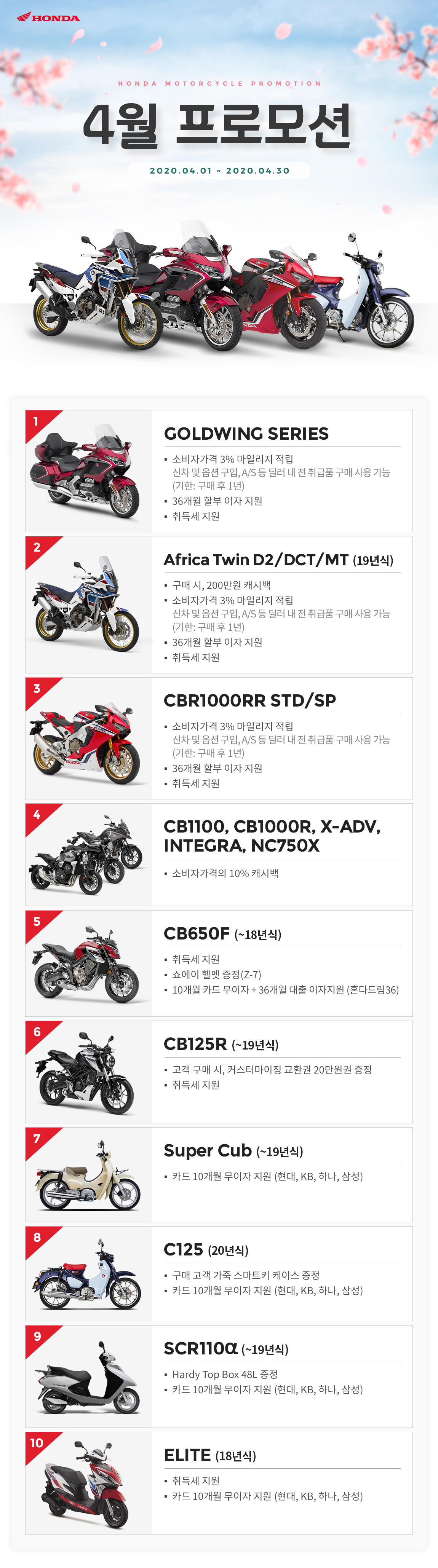 GOLDWING SERIES / AFRICA WIN D2/DCT/MT(19년식) / CBR1000RR STD/SP / CB1100, CB1000R, X-ADV, INTEGRA, NC750X / CB650F(~18년식) / CB125R(~19년식) / Super Cub(~19년식) / C125(20년식) / SCR110a(~19년식) / ELITE(18년식)