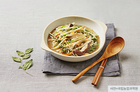재료 : 콩나물 100g, 미나리 90g, 무 40g, 마른 표고버섯 2개, 마른 다시마 1장, 당근 35g, 팽이버섯 1/2개