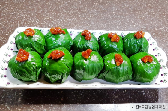 ⑤ 산마늘 잎에 주먹밥을 올린 후 말아 완성한다.