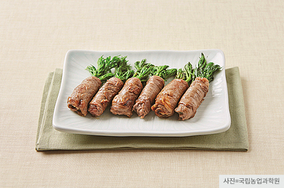 ③ 데친 두릅을 한 김 식힌 뒤, 펼친 소고기 위에 올려 단단하게 만다.
