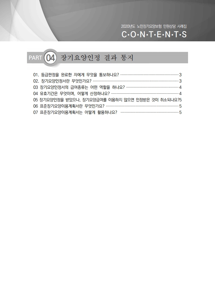 | 2020년도 노인장기요양보험 민원상담 사례집 - 제5장 장기요양급여 종류 및 이용 (0) | 2020.04.09 |