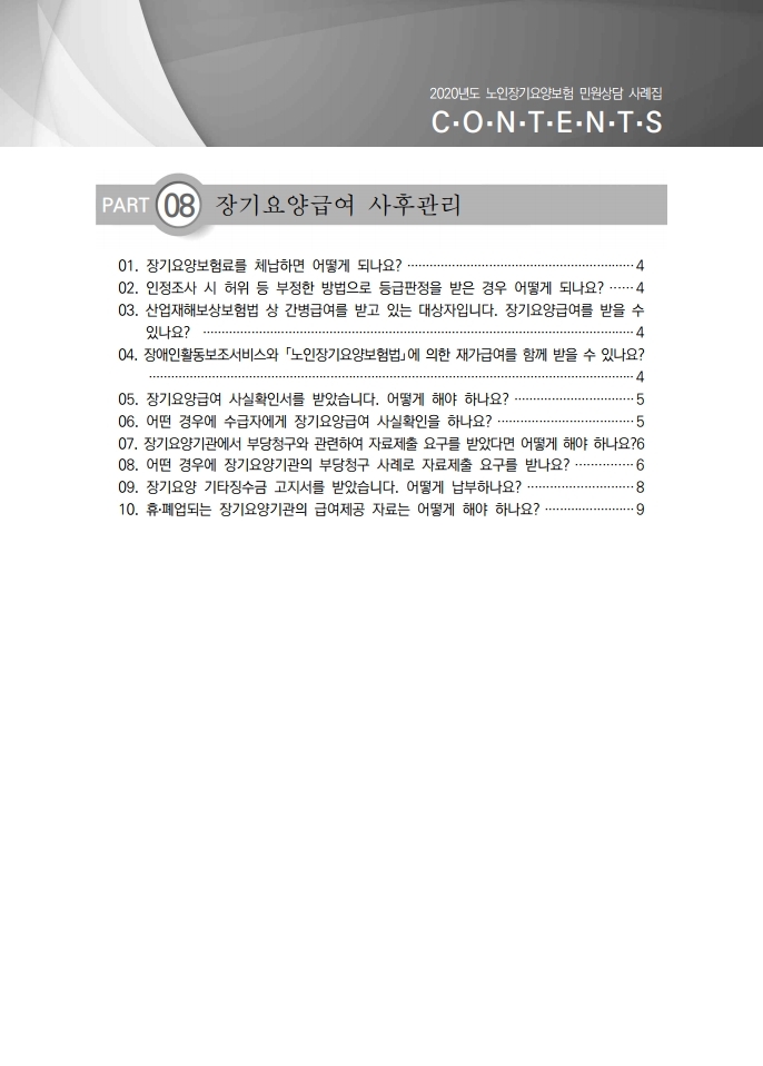 | 2020년도 노인장기요양보험 민원상담 사례집 - 제5장 장기요양급여 종류 및 이용 (0) | 2020.04.09 |