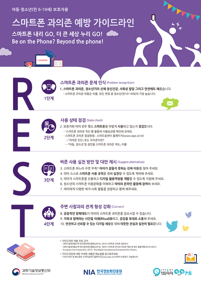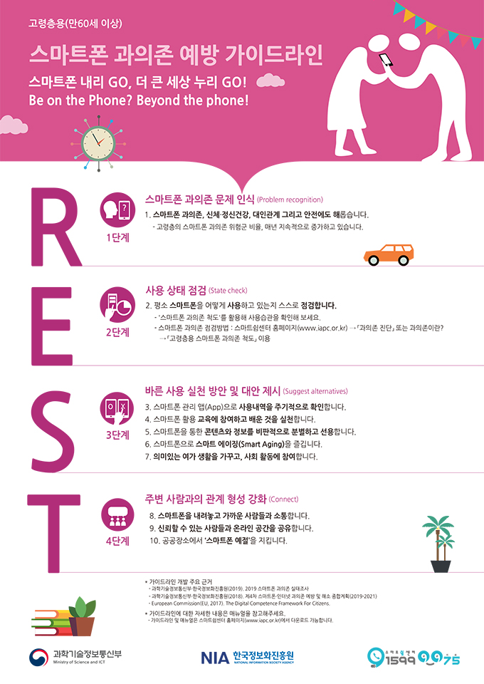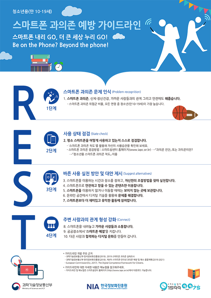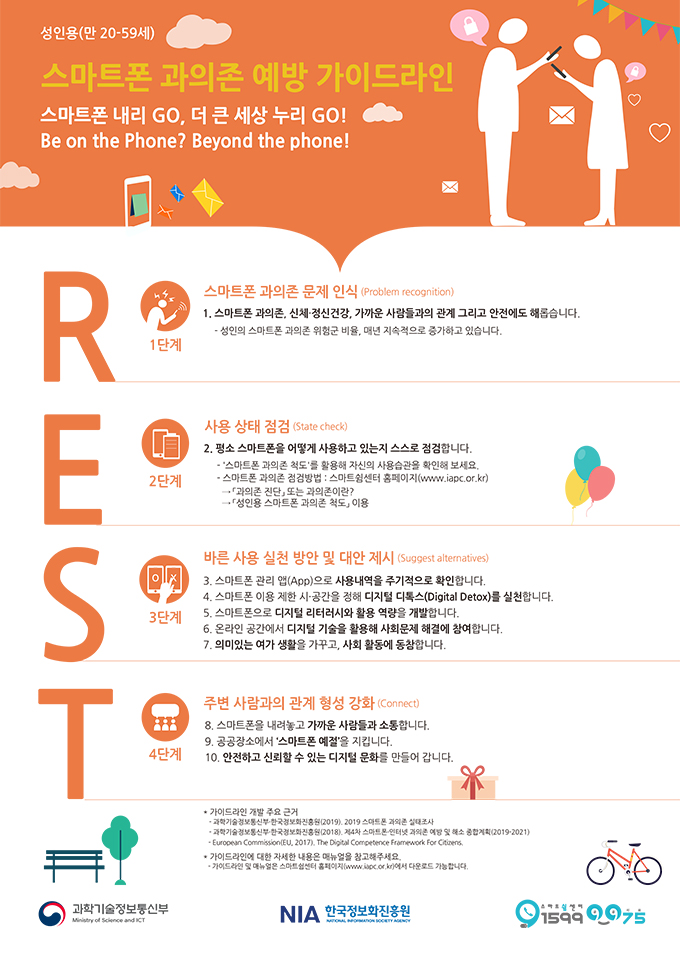 올바르게 스마트폰을 사용하기 위한 실천방법을 대상자별로 2회에 나누어 소개한다. 이번 2회에는 청소년, 아동·청소년 보호자, 성인과 고령층을 위한 실천방법이다.