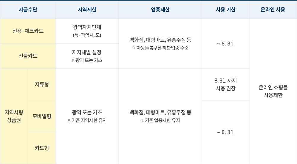 ■ 지급수단별 특성 (지급수단, 선불카드, 지역사랑 상품권, 업종제한, 사용기한. 온라인사용 등)