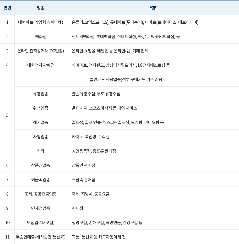 ● 상세한 사용제한 업종(브랜드)는 해당 카드사 홈페이지 및 카드사 콜센터 문의(카드사별 업종분류 기준에 따라 다를 수 있음)