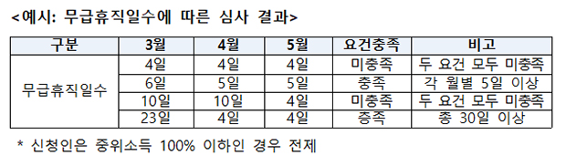 따라서 특정 달에 무급휴직일이 몰려 있는 경우라도 총 무급휴직일이 기준을 충족하는 경우에는 지원받을 수 있음