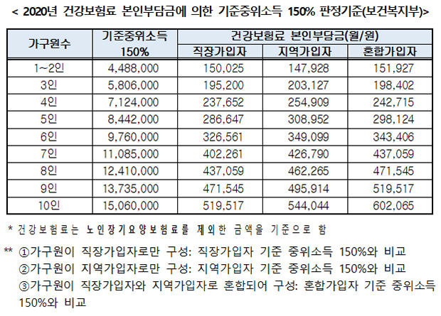 합산한 건강보험료가 가장 적은 달의 건강보험료를 아래의 판정기준과 비교함