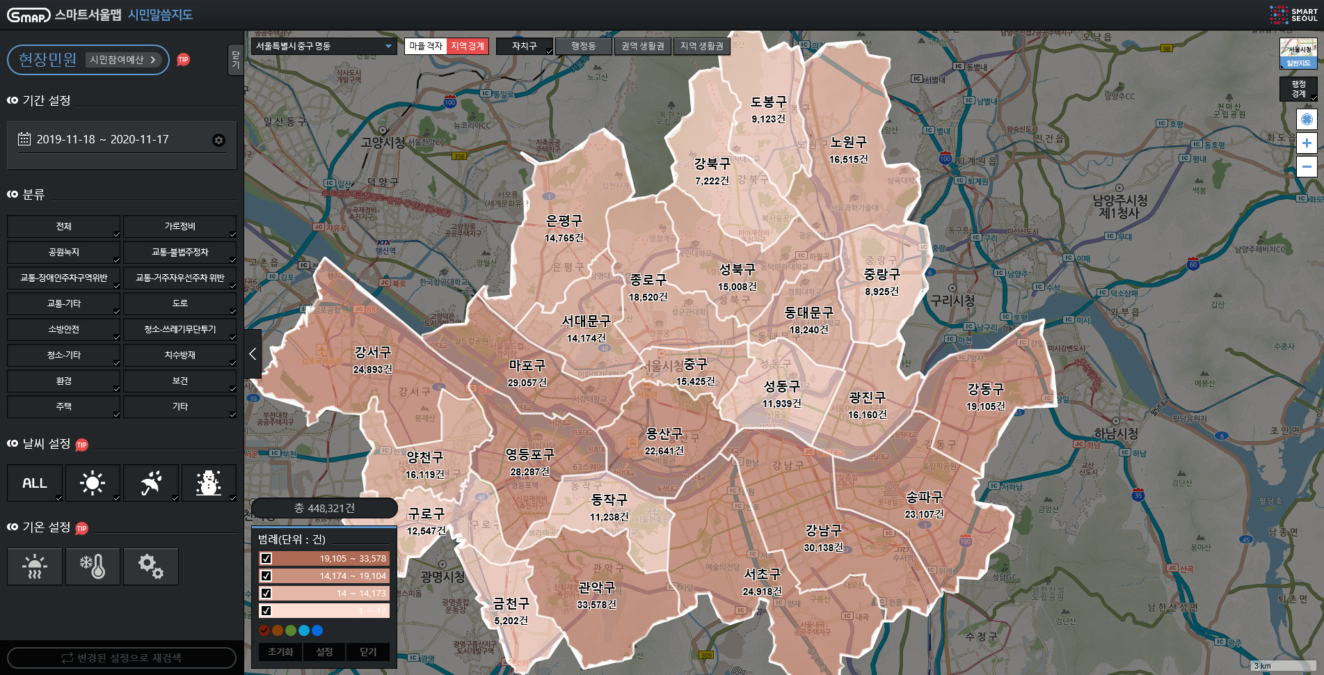 서울시는 앱 기능 개선과 함께 서울스마트 불편신고 홈페이지 메인에 ‘시민말씀지도’ 메뉴를 신설했다. 2018년 이후 앱을 통해 신고된 민원 약 191만 건을 유형‧지역별로 분석한 분포도, 통계자료 등을 시민 누구나 지도로 확인할 수 있다.