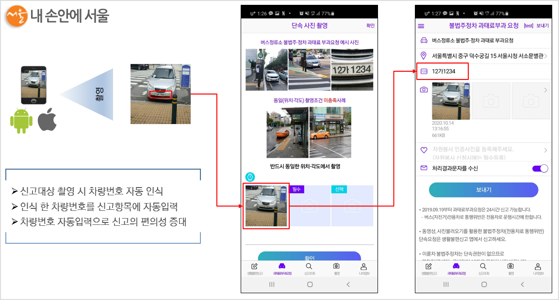 기존에는 신고자가 차량번호를 일일이 수기로 입력했다면, 이제는 앱을 켜고 사진만 찍으면 이미지 파일 속 문자를 텍스트로 자동 변환하는 ‘OCR문자인식’ 기술을 활용해 사진 속 번호판 숫자를 자동으로 인식한다.