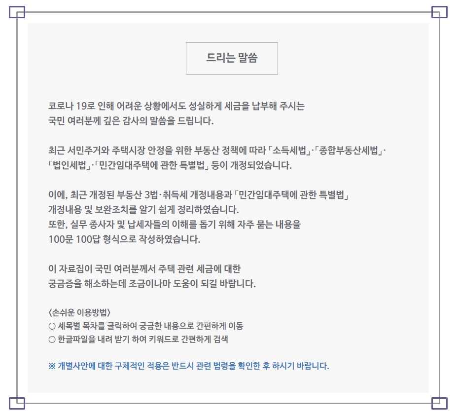 주택관련 세금에 대한 궁금증을 해소해 드립니다 - 부동산 3법 등 주요 개정내용과 주택세금 100문 100답