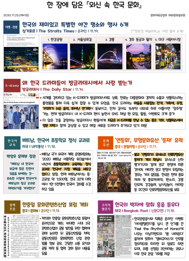 싱가포르의 스트레이츠 타임스는 한강공원, 서울성곽길, 강릉 등 한국의 특별한 야간 명소 등 6곳을 선정해 사진과 함께 보도했습니다. 베트남에서 내년부터 한국어 초등학교 정식 교과 추진을 계획하고 있다는 반가운 소식도 있습니다.