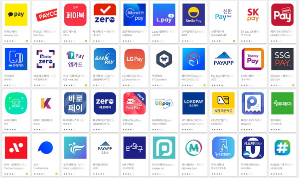 toss(토스), SK Pay(SK플래닛), 페이나우(LG유플러스), ISP페이북(BC카드), 스마일페이(이베이코리아), 케이페이(KG이니시스), LG 페이(LG전자), L Pay(롯데멤버스), PayFAN(신한), KB Pay(KB), 미래에셋페이(미래에셋대우), 알리페이(알리바바) |