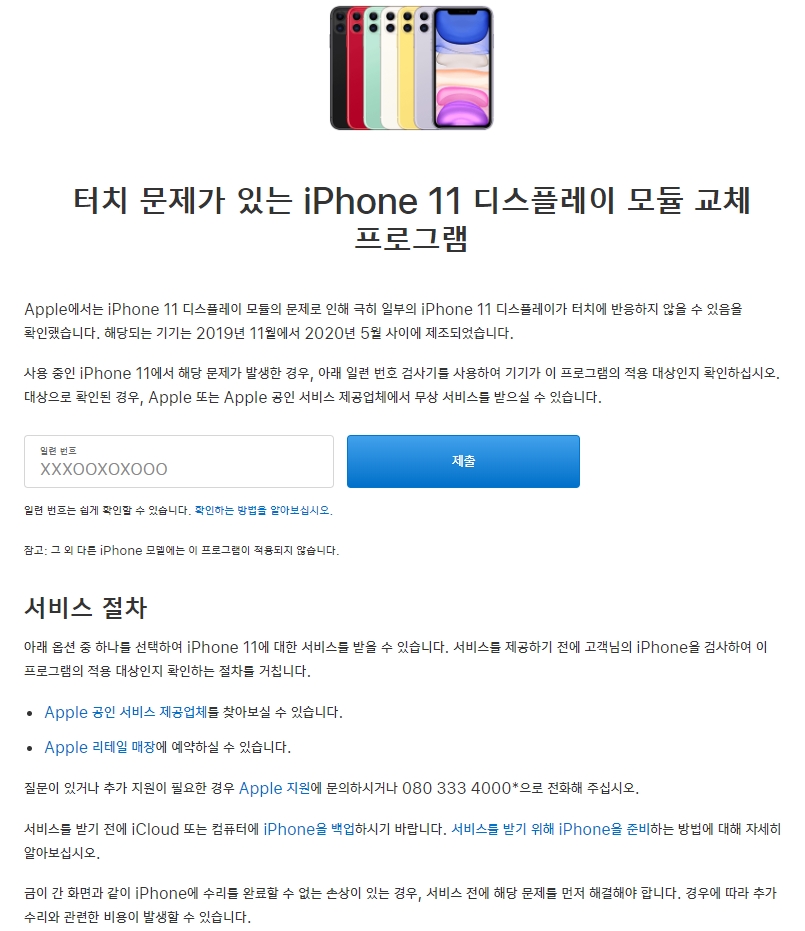 2019년 11월 부터 2020년 5월 제조된 일부 아이폰11 중 터치이슈가 있는 제품들이 해당된다.