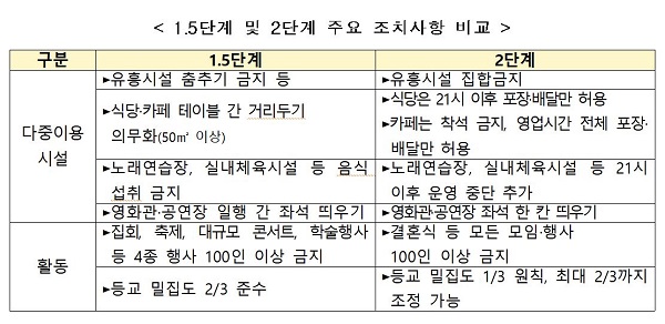 구체적으로 보면 현행 거리두기 2단계에서는 중점관리시설(총 9종) 가운데 유흥주점·단란주점·감성주점·콜라텍·헌팅포차 등 유흥시설 5종의 영업만 금지되지만 2.5단계에서는 방문판매 등 직접판매 홍보관, 노래연습장, 실내 스탠딩 공연장에도 영업 금지를 뜻하는 집합금지 조처가 내려진다.