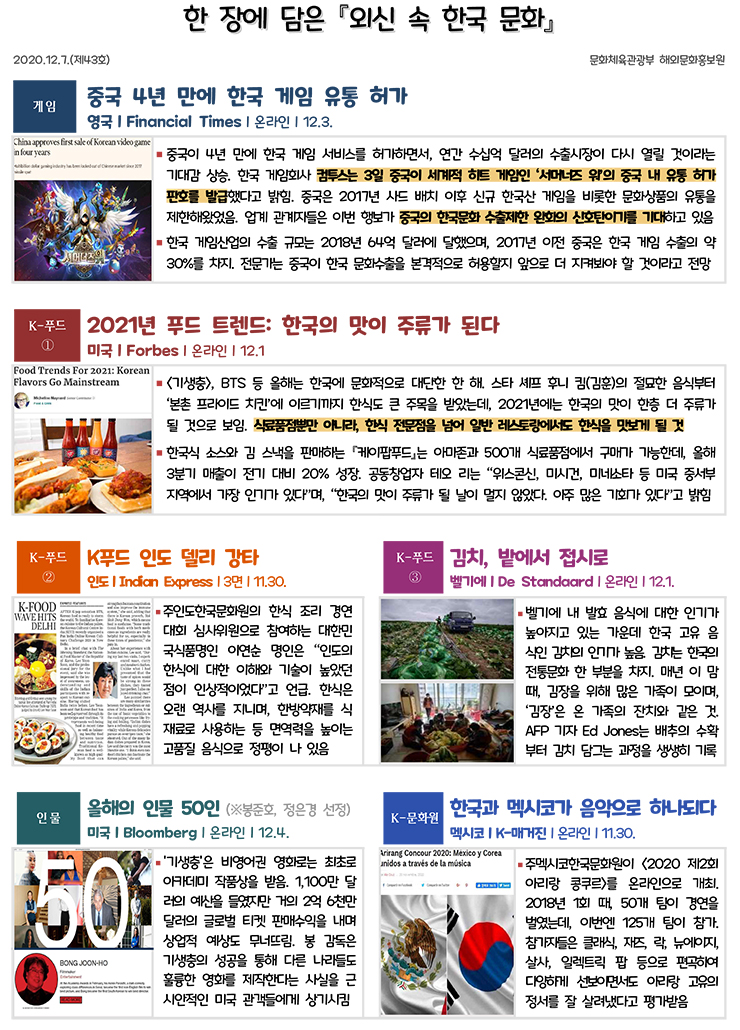 중국이 4년 만에 한국 게임에 대한 중국 내 유통 허가 판호를 발급해 파이낸셜타임스, 로이터 등 유력 외신이 주목했고 미국 블룸버그는 올해의 인물 50인에 봉준호 감독, 정은경 질병관리청장을 선정했습니다.
