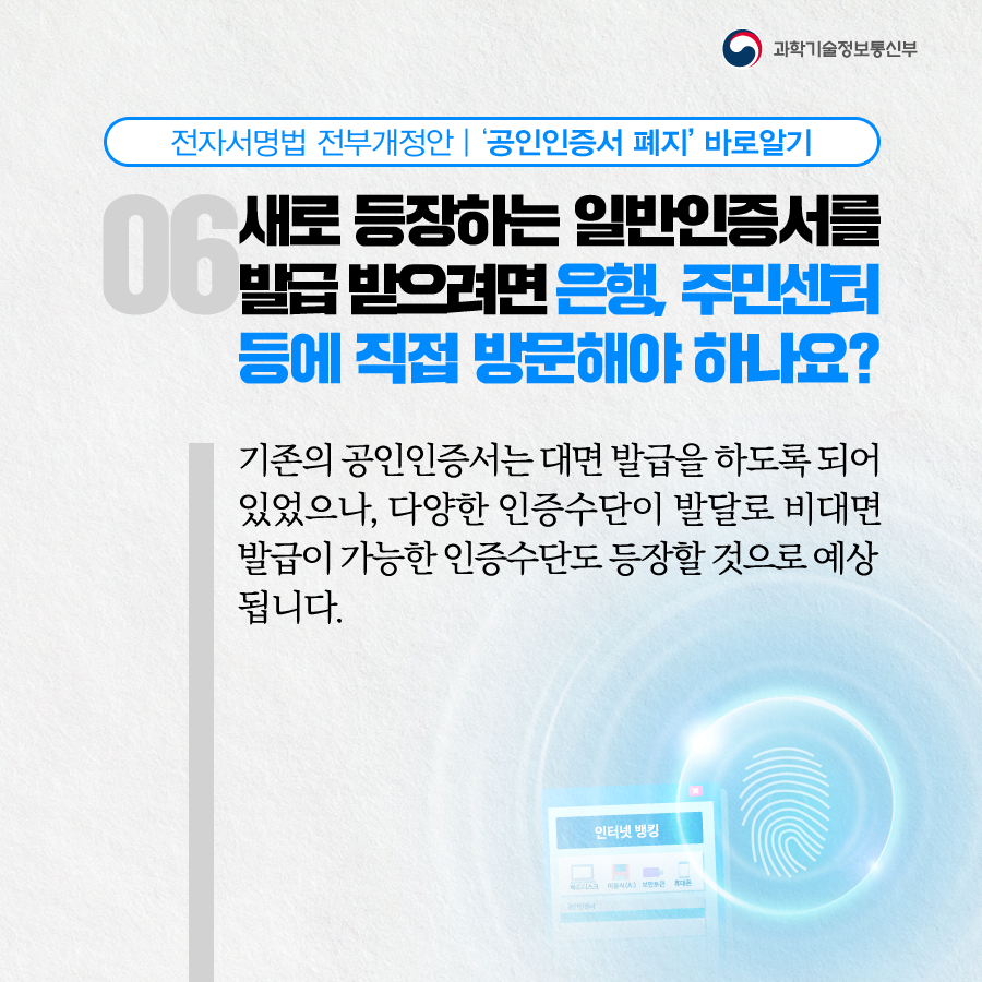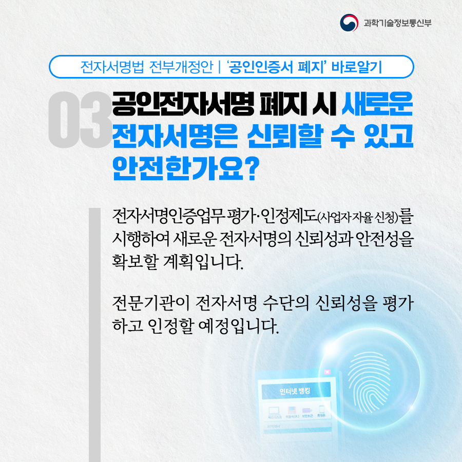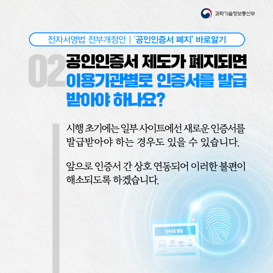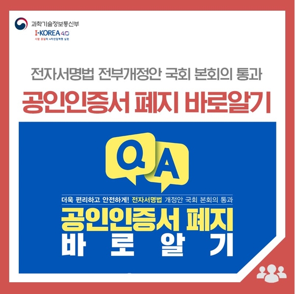 | 공인인증서 더 이상 못 쓴다구요? 아니에요~ 기존 공인인증서로도 연말정산이나 대출한도조회 등 금융거래를 불편없이 이용할 수 있습니다. 그렇다면, 12월 10일 이후 어떤 변화가 있는지 알아볼까요? ① 공인인증서의 명칭이 "공동인증서"로 변경됩니다. 명칭만 변경될 뿐 서비스 이용은 기존과 동일합니다. ② 공인인증서보다 더 편리한 "금융인증서"가 출시되며 다양한 금융기관에서 이용할 수 있습니다. 자세한 내용은 아래 Q&A를 통해 확인할 수 있습니다. Q. 공인인증서가 폐지된다는 데, 무슨 뜻인가요? A. 이번 전자서명법 개정의 주요 내용은 공인인증서와 사설인증서의 구분이 없어지고 정부기관 등에서 본인인증 시에는 민간 기업에서 만든 사설인증서(PASS, 카카오페이 인증 등)도 이용할 수 있다는 뜻입니다. 즉, 다양한 인증으로 본인인증이 가능해집니다. Q. 12월 10일 개정된 전자서명법 시행 이후 기존 공인인증서는 이용 가능한가요? A. 공인인증서라는 명칭이 사라지며 "공동인증서"로 명칭만 바뀝니다. 현재 보유하고 있는 공인인증서는 유효기간까지 동일한 방법으로 이용할 수 있으며, 시행일 이후에도 "공동인증서" 발급/재발급 가능합니다. Q. 공인인증서는 기존과 이용방법 등 거래시 변경되는 부분이 있나요? A. 변경되는 부분 없으며, 기존대로 이용하시면 됩니다. Q. 새로운 금융인증서가 뭔가요? A. 인증서를 클라우드에 발급 및 보관하여, 언제 어디서나 클라우드에 등록된 기기(스마트폰, PC 등)에서 이용할 수 있는 인증서입니다. Q. 금융인증서는 무엇이 좋은가요? A. 별도의 설치(Active X) 없이 가능하고 복잡한 비밀번호 대신 패턴, 생체인증 등을 이용하여 인증할 수 있으며 유효 기간도 3년으로 늘어나 갱신의 불편도 해소한 인증서입니다. 또한, 인증서 이용내역을 확인할 수 있어서 더욱 안전한 거래가 가능합니다. Q. 금융인증서를 발급 받으면 기존에 이용하던 공동인증서(구 공인인증서)는 어떻게 되나요? A. 기존에 이용하던 공동인증서가 있어도 금융인증서 발급이 가능하며 둘다 이용 가능합니다. Q. 금융인증서도 타기관에서 이용 가능한가요? A. 가능합니다. 해당 기관의 타기관 등록절차를 수행하시면 이용 가능합니다. Q. 금융인증서를 공공기관에서도 이용이 가능한가요? A. 금융인증서를 도입한 기관에서는 이용 가능합니다. 현재 정부24, 건강보험공단에서는 이용이 가능하며, 타 공공기관은 순차적으로 도입 적용 예정입니다. 자세한 사항은 해당 공공기관으로 문의하시면 됩니다. |