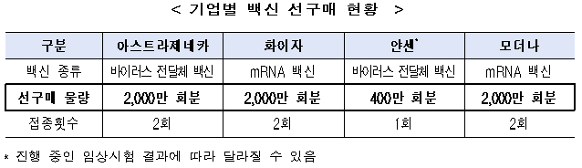 이를 위해 정부는 그동안 민간 전문가와 함께 기업별 공급 조건 및 안전성·유효성 등에 대한 검토를 진행해 왔으며, 안전성·효과성이 좋고 성공가능성이 높은 백신 확보를 위해 신중하게 협상을 진행해 왔다.