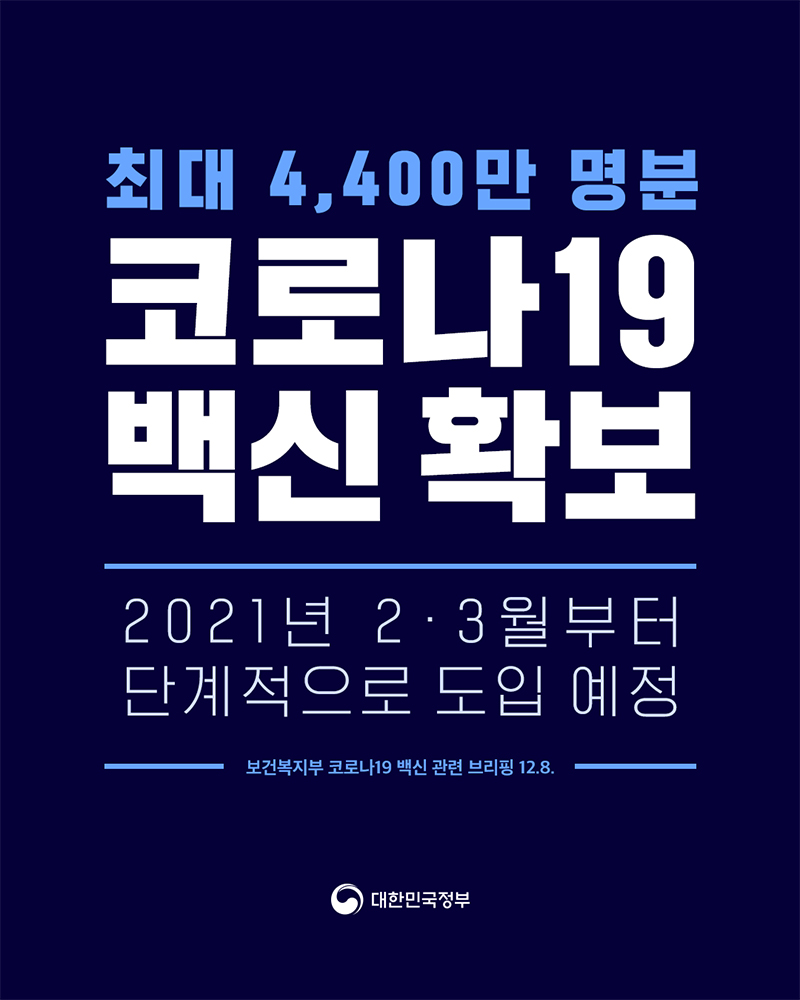이날 회의를 통해 정부는 코박스 퍼실러티(COVAX Facility, 약 1000만 명분) 및 글로벌 백신 기업(약 3400만 명분)을 통해 최대 4400만명 분의 해외개발 백신을 선구매한다고 밝혔다.