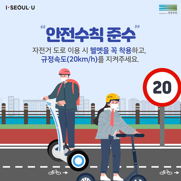 12월 10일부터 한강공원 내 자전거도로에서 전동 킥보드를 이용할 수 있습니다. 이는 ‘도로교통법’, ‘자전거 이용 활성화에 관한 법률’이 개정됨에 따라 가능해졌는데요. 이와 함께 안전사고에 대한 우려도 커지고 있습니다. 서울시 한강사업본부는 보행자·자전거이용자·개인형 이동장치 이용자 모두가 안전하게 한강공원을 이용할 수 있도록 시설을 정비하고 안전수칙을 홍보합니다. 한강공원에서 전동 킥보드 등 개인형 이동장치를 운행할 때는 20㎞/h 안전속도를 준수해야 하고, 안전모 착용, 음주운전을 해서는 안됩니다. 또 통행에 위험이 되는 무단주차·방치도 금지합니다. 조금 불편하지만 모두의 안전을 위해, 한강공원에서는 안전수칙을 꼭 지켜주세요.