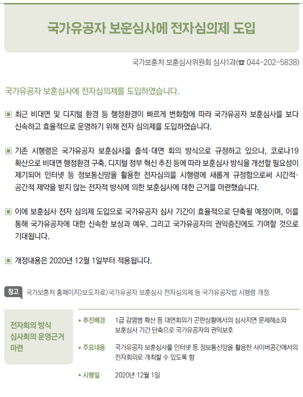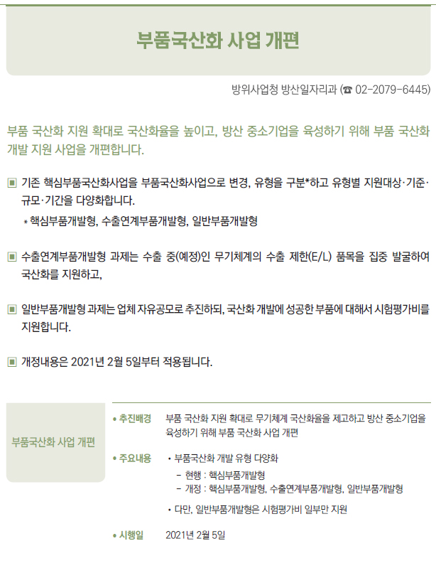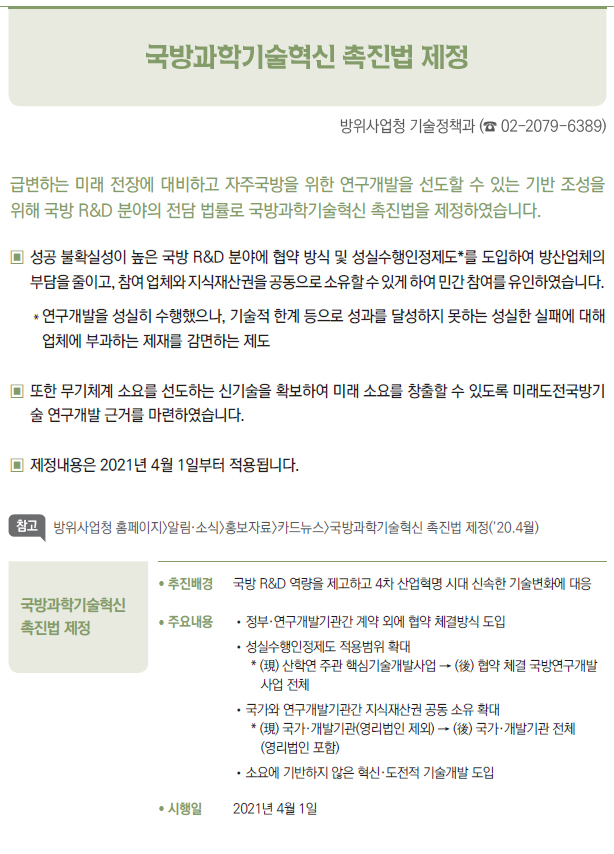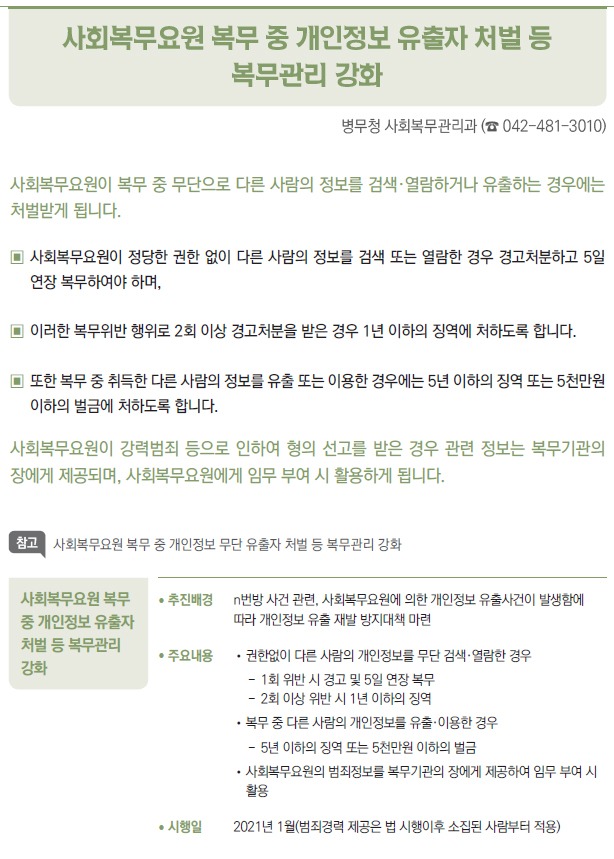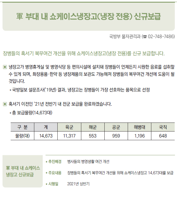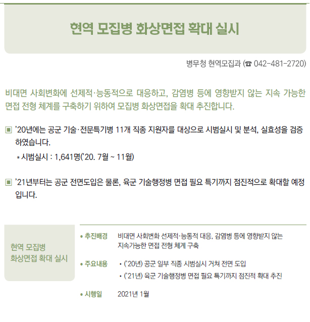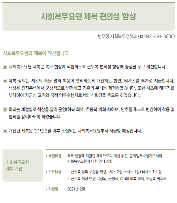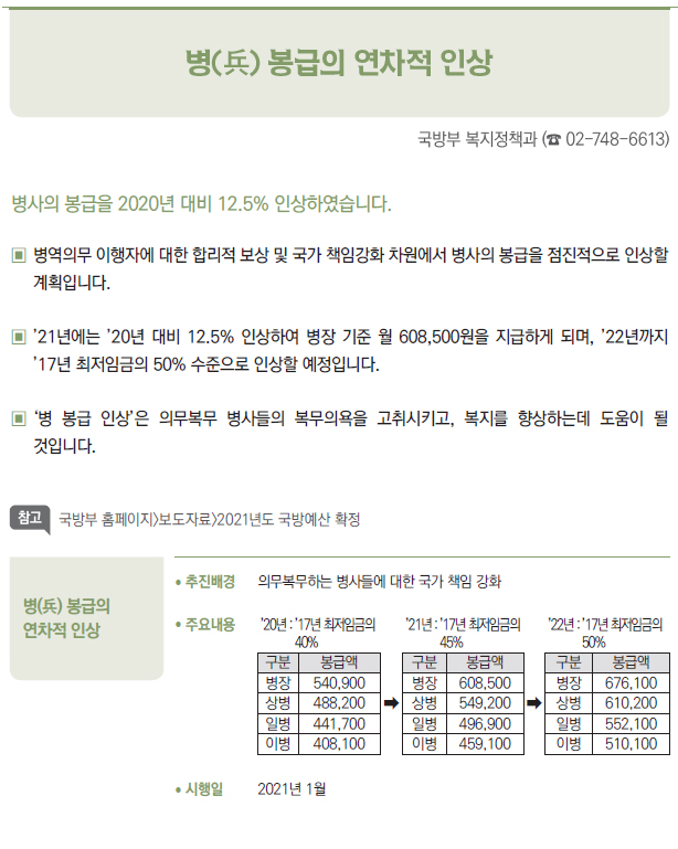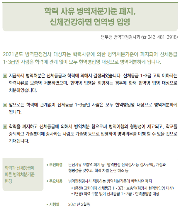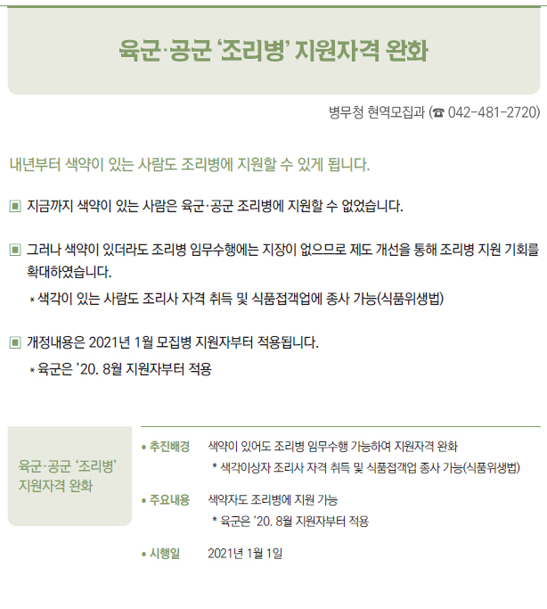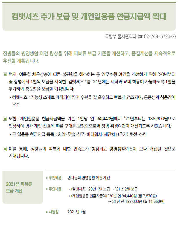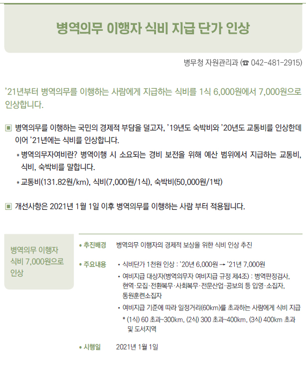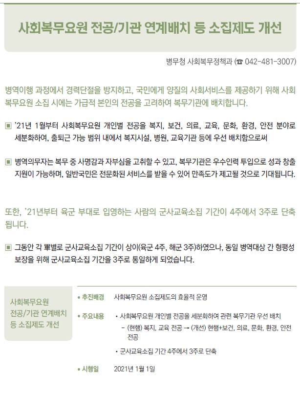 | [2021년부터 달라지는 것] ③ 국방·병무 - 병(兵) 봉급의 연차적 인상 - 의료환경의 변화 등에 따라 신체등급의 판정기준을 개선 - 입영연기 대상에 우수 대중문화예술인 추가 - 컴뱃셔츠 추가 보급 및 개인일용품 현금지급액 확대 - 軍 부대 내 쇼케이스냉장고(냉장 전용) 신규보급 - 제주지역 거주·근무 병사 항공료 지원 확대 - 예비군간부 비상근 복무제도 확대 운영 - 예비군 건강보호를 위해 열화상카메라 훈령장 신규 설치 및 마스크 지급 확대 - 보충역 군사훈련 기간 조정 - 국가유공자 보훈심사에 전자심의제 도입 - 사회복무요원 복무 중 개인정보 유출자 처벌 등 복무관리 강화 - 「청춘디딤돌, 병역진로설계」 서비스 확대 - 경제적 취약자 병무용진단서 발급비용 등 지원 - 현역 모집병 화상면접 확대 실시 - 육군·공급'조리병'지원자격 완화 - 병역의무 이행자 식비 지급 단가 인상 - 사회복무요원 전공/기관 연계배치 등 소집제도 개선 - 사회복무요원 제복 편의성 향상 - 사회복무요원 복무기관 재지정 이의신청제도 마련 - 학력 사유 병역처분기준 폐지, 신체건강하면 현역병 입영 - 부품국산화 사업 개편 - 국방과학기술혁신 촉진법 제정 |