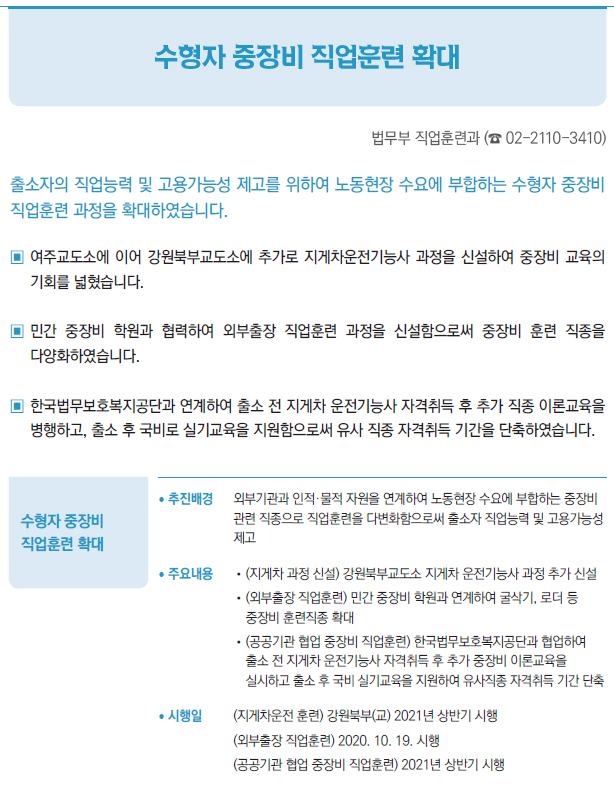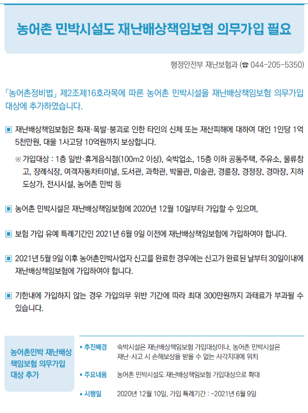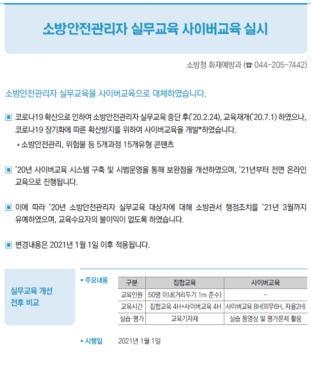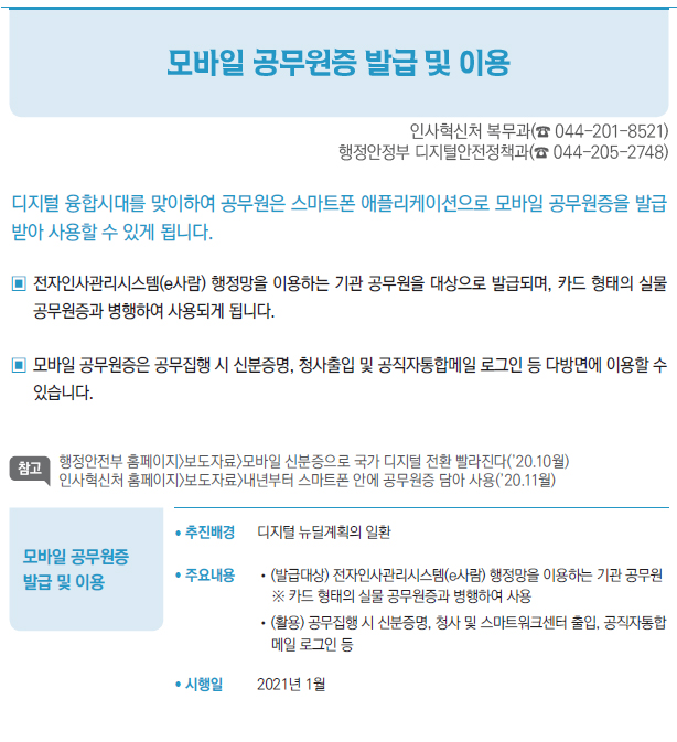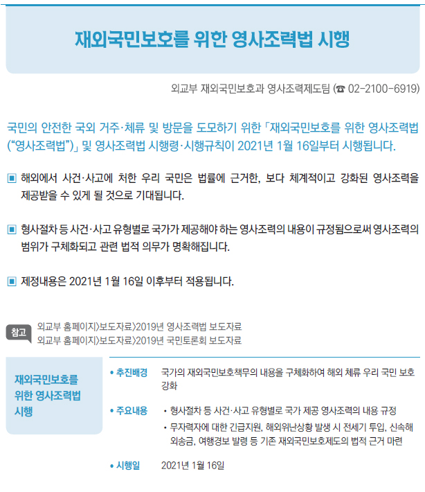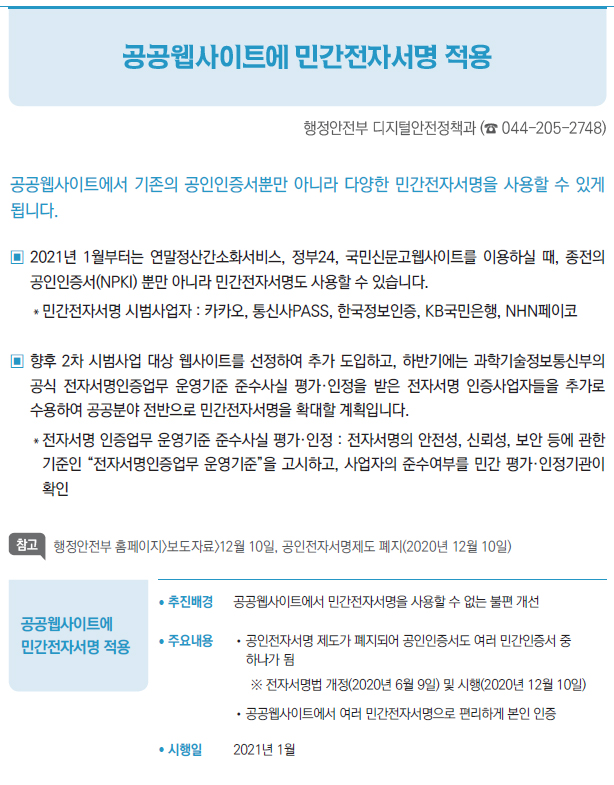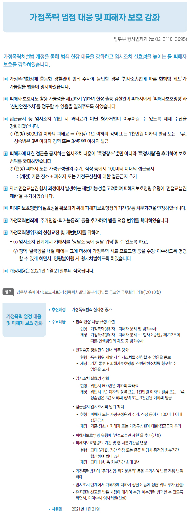 | [2021년부터 달라지는 것] ④ 행정·안전·질서 - 「공문서에 대한 아포스티유 및 본부영사확인서 발급에 관한 규정」 제정 - 재외국민보호를 위한 영사조력법 시행 - 2021년 이산가족 실태조사 실시안내 - 국민의 북한 특수자료 이용 절차 간소화 - 가정폭력 엄정 대응 및 피해자 보호 강화 - 국가송무체계 개선 - 대한민국을 방문하는 외국인에게 전자여행허가(ETA) 제도를 시행합니다 - 출입국사범 범칙금 신용카드 납부제도 시행 - 출국명령 이행보증금 제도 시행 - 변호사시험 시험장 전국 확대 및 응시자 편의 개선 - Post 코로나 대비 교정기관 원격의료시스템 활성화 - 수형자 중장비 직업훈련 확대 - 모바일 전자증명서 발급 확대(13종 →100종) - 청년마을 조성 확대 - 공공 마이데이터 서비스 시행 - 「정부24」 국가보조금 맞춤형서비스 제공 - 풍수해보험 보험료 정부지원 대폭 확대 - 농어촌 민박시설도 재난배상책임보험 의무가입 필요 - 차세대 주민등록시스템 전면 도입 - 공공웹사이트에 민간전자서명 적용 - 「공공기관의 정보공개에 관한 법률」 개정 - 옥외광고사업자 손해배상 책임보험 가입 의무화 - 정부청사, 그린 뉴딜을 통한 "그린 청사" 조성 - 장애인·고령자의 무인민원발급기 접근성 개선 - 맹견 소유자 책임보험 가입 의무화 - 동물판매업자 등록대상동물 판매 시 등록 의무화 - 성폭력 피해자에 대한 불이익조치 금지 의무 강화 - 바이오의약품 특별보안검색 제도개선 - 국가공무원 7급 공채시험 공직적격성평가(PSAT) 도입 - 국가·지방공무원 공채 시험 대체시험성적 인정기간 연장 - 모바일 공무원증 발급 및 이용 - 법령정보 수집·관리·제공 방식의 획기적 개선 - 사회적기업 등에 대한 공공입찰 우대 강화 - 개정 형사소송법·검찰청법 및 하위법령 시행 - 주민밀착형 치안서비스를 위한 자치경찰제 도입 - 어린이보호구역 내 주정차위반 과태료·범칙금이 기존 일반도로의 2배에서 3배로 상향 - 안전속도 5030 정책 전국시행 - 소방안전관리자 실무교육 사이버교육 실시 - 위험물 운반차량 운전자 자격요건 신설 - 공정위 조사·심의 적법 절차 획기적 강화 - (가맹) 정보공개서 기재사항 확대 - 소비자중심경영(CCM) 인증제도 규정 정비 - 도서산간지역 추가배송비, 상품대금 결제 전 고지 의무화 |