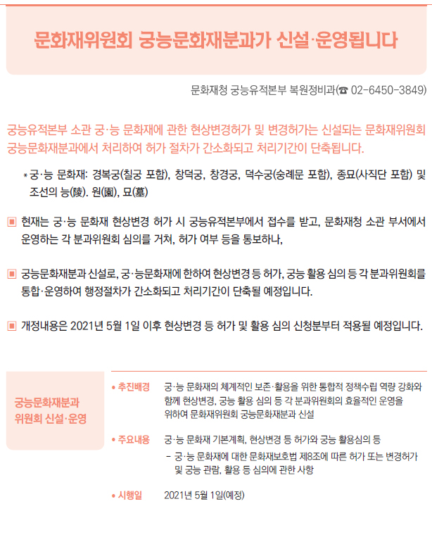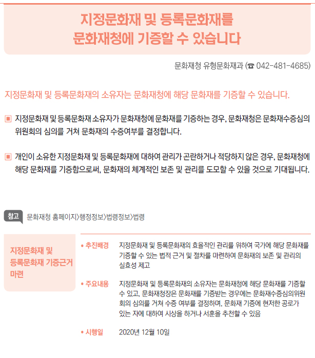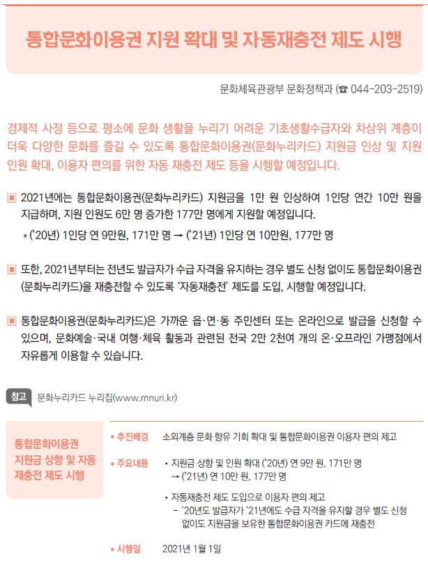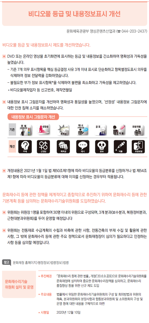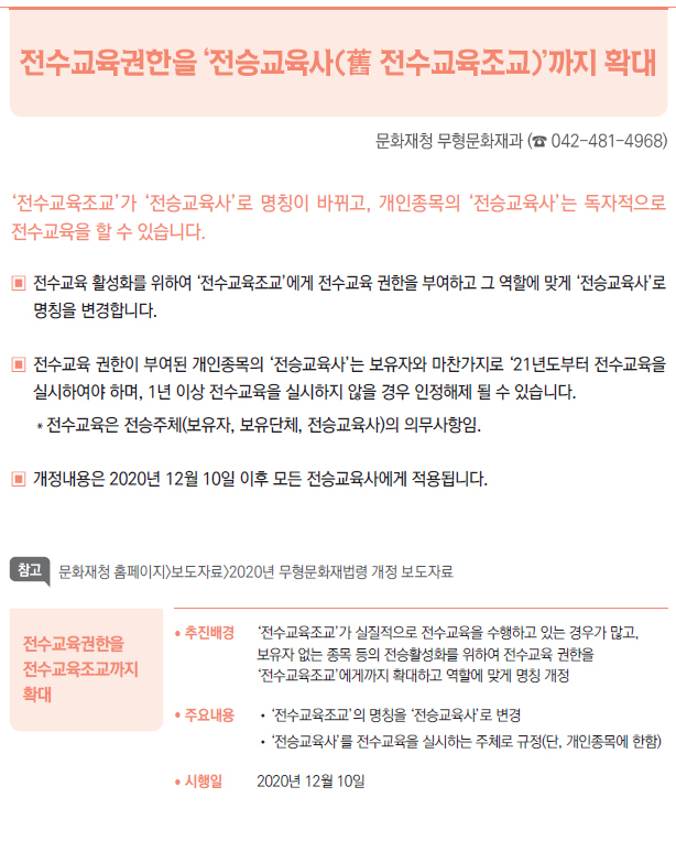 | [2021년부터 달라지는 것] ⑤ 문화·체육·관광 - 통합문화이용권 지원 확대 및 자동재충전 제도 시행 - 비디오물 등급 및 내용정보표시 개선 - 전수교육권한을 '전승교육사(舊 전수교육조교)'까지 확대 - 지정문화재 및 등록문화재를 문화재청에 기증할 수 있습니다. - 문화재위원회 궁능문화재분과가 신설·운영됩니다. |