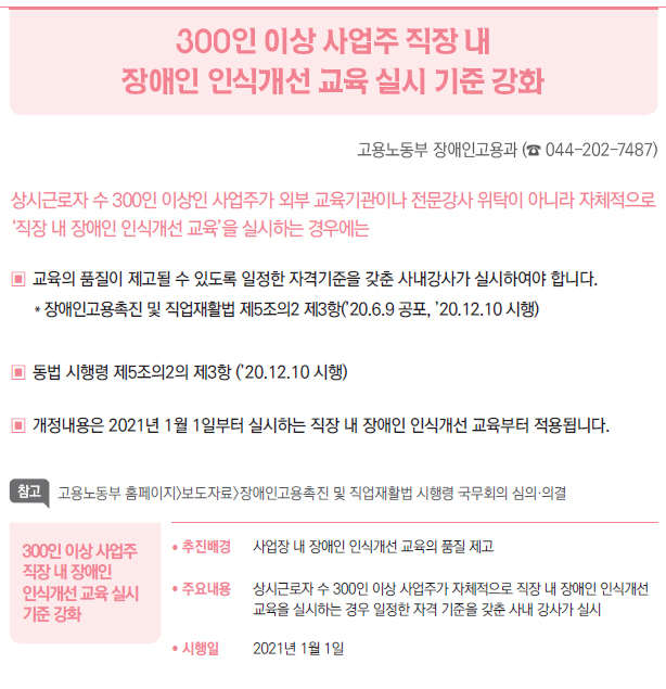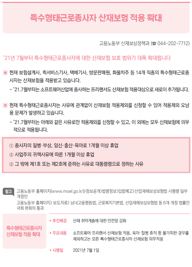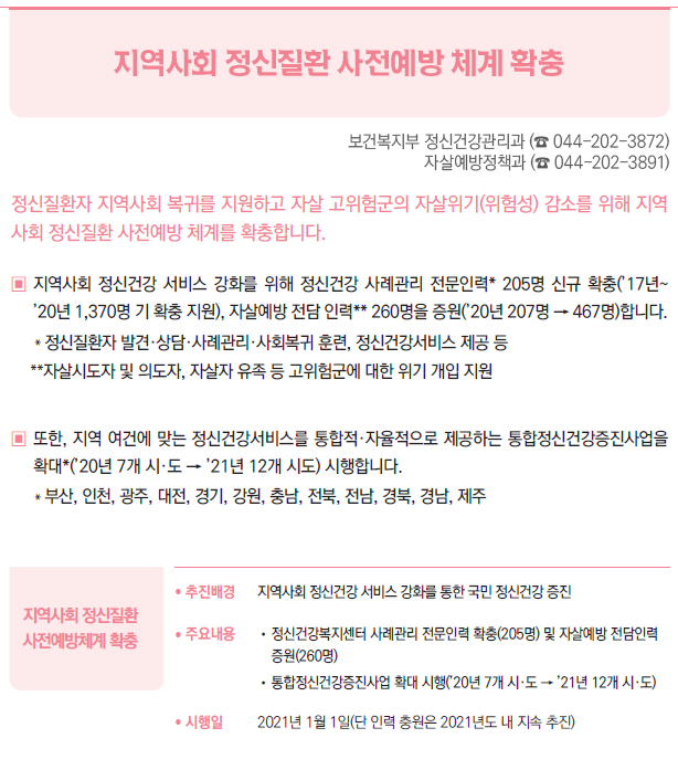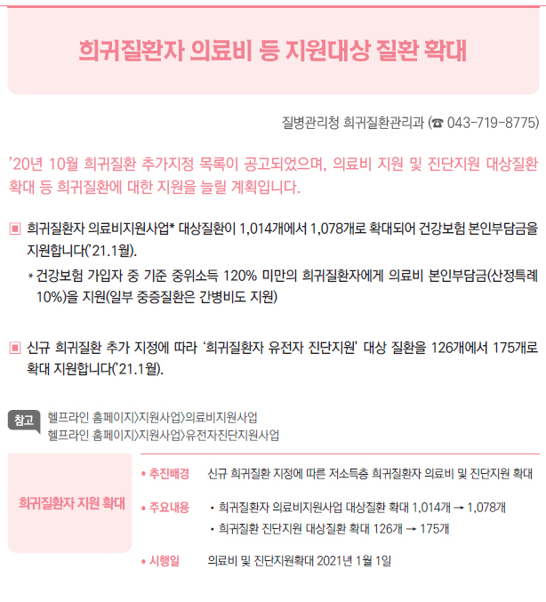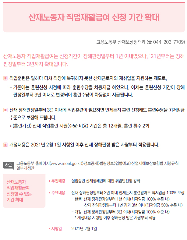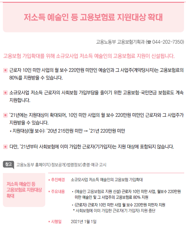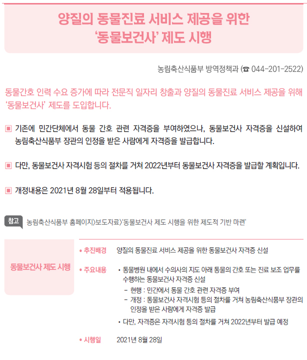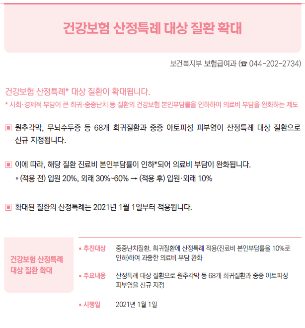 | [2021년부터 달라지는 것] ⑨ 보건·복지·고용 - 양질의 동물진료 서비스 제공을 위한 '동물보건사' 제도 시행 - 방역위생관리업자를 통한 전문적 소독 및 방제의무 시행 - 부양의무자 기준 완화 등 생계급여 제도 개선 - 장애인연금 기초급여액 월 30만원으로 인상 - 기초연금 지급 확대 - 지역 간 필수의료 격차 해소를 위해 권역·지역별 책임의료기관을 확충 - 청년저축계좌 가입기회 확대 - 차세대 사회보장정보시스템을 통한 맞춤형 사회보장급여 안내 - 발달장애인 지원 확충 - 공공 아동보호체계 구축 - 생애 초기 건강관리 시범사업 서비스 지역 확대 - 드럼스타트 슈퍼바이저 10명 최소 배치 - 노인맞춤돌봄서비스 대상자 및 서비스 확대·강화 - 천만노인시대 대비 고령친화서비스 연구개발사업 실시 - 의료기기 규제혁신으로 신의료기술 의료현장 진입 기간 단축 - 건강보험 산정특례 대상 질환 확대 - 협력기관간 진료의뢰·회송 활성화 - 결핵 유소견자 확진검사비 본인부담 면제 - 건강보험 보장성 확대 흉부(유방) 및 심장 초음파 건강보험 적용 확대 - 국가건강검진 이렇게 달라집니다 - 아동치과주치의 건강보험 시범사업 추진 - 지역사회 정신질환 사전예방 체계 확충 - 장애인 활동지원 서비스 확대·강화 - 국민취업지원제도 시행 - 예술인 고용보험 적용 - 장애인 고용부담금 부담기초액 인상 - 공무원 부문 장애인 고용부담금 신고·납부 - 관공서 공휴일 민간기업 적용 확대 - 「물질안전보건자료(MSDS) 제출 및 대체자료 기재 심사제도」 시행 - 저소득 예술인 등 고용보험료 지원대상 확대 - 「일자리 안정자금」 지원 지속 - 중증장애인 근로자 출퇴근 비용 지원 시범사업 시행 - 300인 이상 사업주 직장 내 장애인 인식개선 교육 실시 기준 강화 - 출산육아기 고용안정장려금 중소기업 지원 확대 - 직장어린이집 인건비·운영비 지원요건 완화 - 최저임금액 인상 - 근로자 생활안정자금 융자 "자녀양육비" 융자 신설 근로자 생활안정자금 융자 대상 확대 - 대표이사의 "안전·보건에 관한 계획" 수립 및 이사회 보고·승인 - 특수형태근로종사자 산재보험 적용 확대 - 「공정안전보고서 제출 대상 유해·위험물질 규정량 조정」 시행 - 산재노동자 직업재활급여 신청 기간 확대 - 새일여성인턴 참여기업 지원금 및 지원대상 확대 - '21.1월부터 "청년 주거급여 분리지급" 시행 - 코로나19 대응 제품개발 및 안전관리 강화 - 어린이 급식소 급식위생 및 식중독 예방 강화 - 마약류 사범 재범예방 의무화 교육 실시 - 해외직구식품 안전검사 확대 - 혁신의료기기소프트웨어 제조기업 인증제도 시행 - 규제과학 전문인력 양성을 위한 교육·훈련 지원 - 근로장려금 중증장애 직계존속 부양가구 지원 확대 - 어르신 폐렴구균(PPSV23) 예방접종 접종기관 확대 - 거동불편 장애인 집에서 결핵검진 가능 - 희귀질환자 의료비 등 지원대상 질환 확대 - 희귀질환자 의료비지원 온라인 신청 확대 - 국가지정 입원치료병상 음압병실 확충 - 보건소 상시 선별진료소 구축으로 편안한 진료·검사 환경제공 - 감염병 환자 개인정보 노출 보호 |