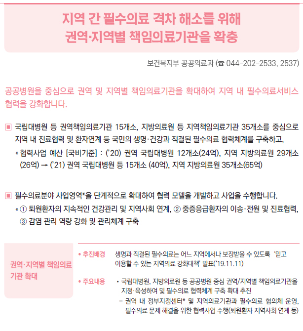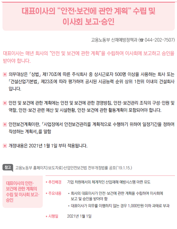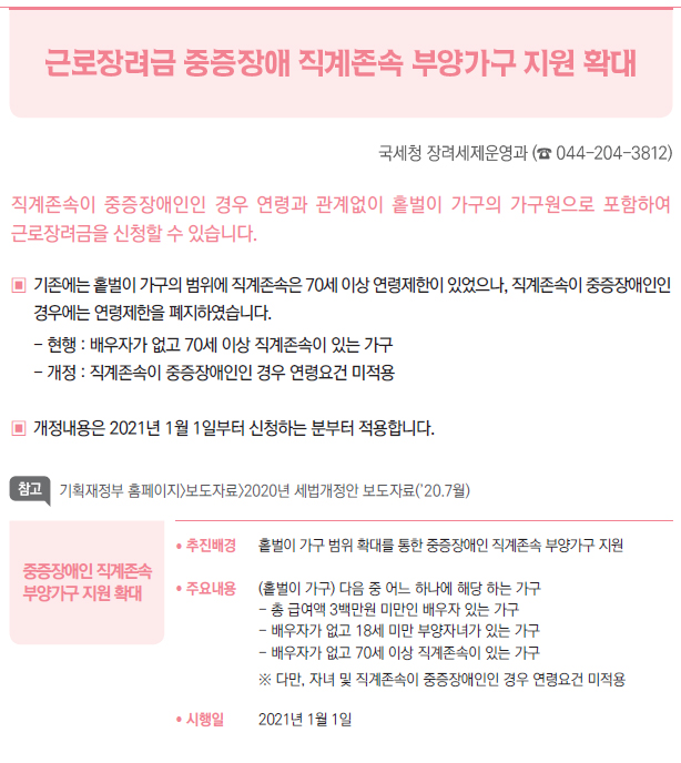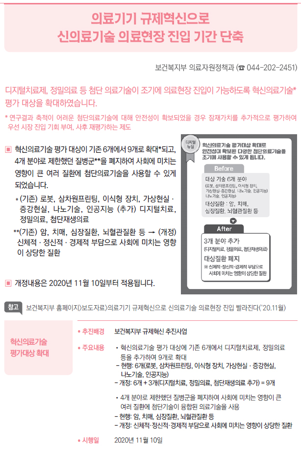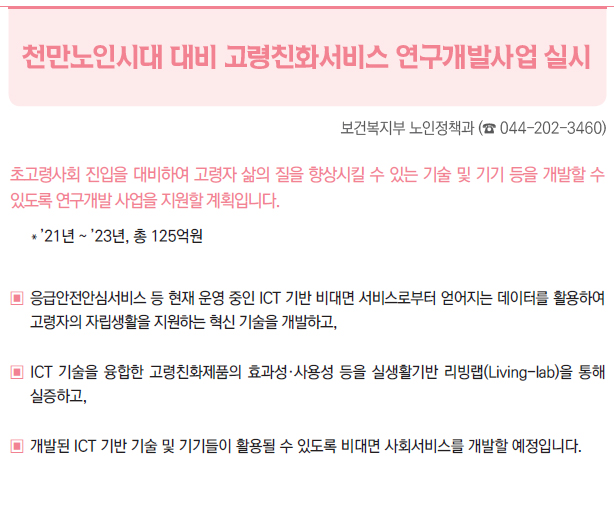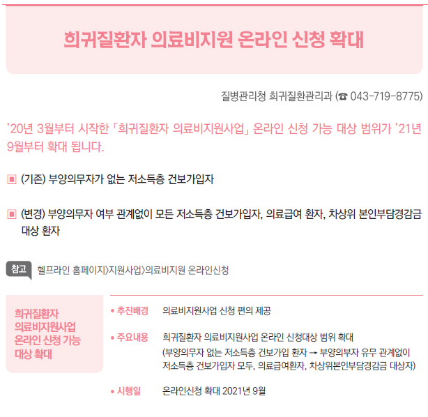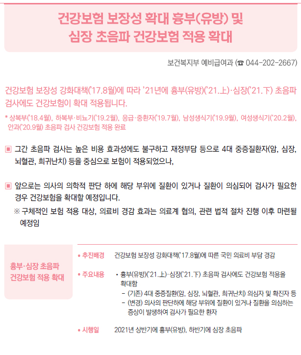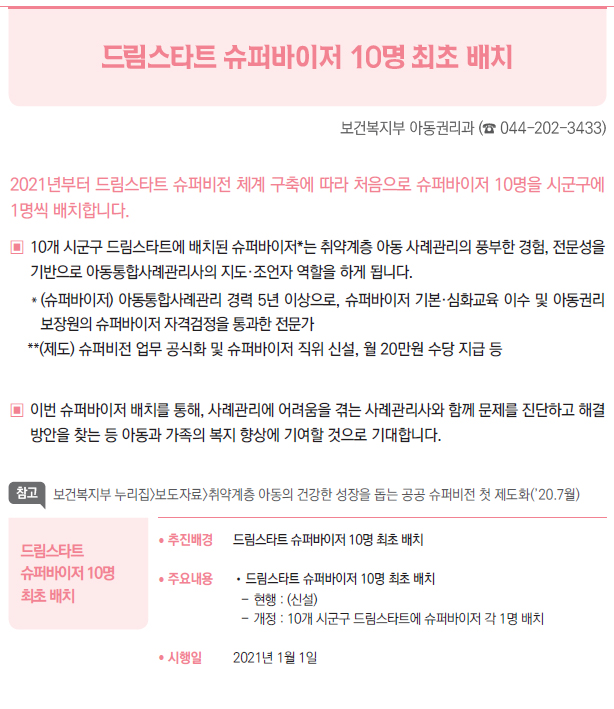 | [2021년부터 달라지는 것] ⑨ 보건·복지·고용 - 양질의 동물진료 서비스 제공을 위한 '동물보건사' 제도 시행 - 방역위생관리업자를 통한 전문적 소독 및 방제의무 시행 - 부양의무자 기준 완화 등 생계급여 제도 개선 - 장애인연금 기초급여액 월 30만원으로 인상 - 기초연금 지급 확대 - 지역 간 필수의료 격차 해소를 위해 권역·지역별 책임의료기관을 확충 - 청년저축계좌 가입기회 확대 - 차세대 사회보장정보시스템을 통한 맞춤형 사회보장급여 안내 - 발달장애인 지원 확충 - 공공 아동보호체계 구축 - 생애 초기 건강관리 시범사업 서비스 지역 확대 - 드럼스타트 슈퍼바이저 10명 최소 배치 - 노인맞춤돌봄서비스 대상자 및 서비스 확대·강화 - 천만노인시대 대비 고령친화서비스 연구개발사업 실시 - 의료기기 규제혁신으로 신의료기술 의료현장 진입 기간 단축 - 건강보험 산정특례 대상 질환 확대 - 협력기관간 진료의뢰·회송 활성화 - 결핵 유소견자 확진검사비 본인부담 면제 - 건강보험 보장성 확대 흉부(유방) 및 심장 초음파 건강보험 적용 확대 - 국가건강검진 이렇게 달라집니다 - 아동치과주치의 건강보험 시범사업 추진 - 지역사회 정신질환 사전예방 체계 확충 - 장애인 활동지원 서비스 확대·강화 - 국민취업지원제도 시행 - 예술인 고용보험 적용 - 장애인 고용부담금 부담기초액 인상 - 공무원 부문 장애인 고용부담금 신고·납부 - 관공서 공휴일 민간기업 적용 확대 - 「물질안전보건자료(MSDS) 제출 및 대체자료 기재 심사제도」 시행 - 저소득 예술인 등 고용보험료 지원대상 확대 - 「일자리 안정자금」 지원 지속 - 중증장애인 근로자 출퇴근 비용 지원 시범사업 시행 - 300인 이상 사업주 직장 내 장애인 인식개선 교육 실시 기준 강화 - 출산육아기 고용안정장려금 중소기업 지원 확대 - 직장어린이집 인건비·운영비 지원요건 완화 - 최저임금액 인상 - 근로자 생활안정자금 융자 "자녀양육비" 융자 신설 근로자 생활안정자금 융자 대상 확대 - 대표이사의 "안전·보건에 관한 계획" 수립 및 이사회 보고·승인 - 특수형태근로종사자 산재보험 적용 확대 - 「공정안전보고서 제출 대상 유해·위험물질 규정량 조정」 시행 - 산재노동자 직업재활급여 신청 기간 확대 - 새일여성인턴 참여기업 지원금 및 지원대상 확대 - '21.1월부터 "청년 주거급여 분리지급" 시행 - 코로나19 대응 제품개발 및 안전관리 강화 - 어린이 급식소 급식위생 및 식중독 예방 강화 - 마약류 사범 재범예방 의무화 교육 실시 - 해외직구식품 안전검사 확대 - 혁신의료기기소프트웨어 제조기업 인증제도 시행 - 규제과학 전문인력 양성을 위한 교육·훈련 지원 - 근로장려금 중증장애 직계존속 부양가구 지원 확대 - 어르신 폐렴구균(PPSV23) 예방접종 접종기관 확대 - 거동불편 장애인 집에서 결핵검진 가능 - 희귀질환자 의료비 등 지원대상 질환 확대 - 희귀질환자 의료비지원 온라인 신청 확대 - 국가지정 입원치료병상 음압병실 확충 - 보건소 상시 선별진료소 구축으로 편안한 진료·검사 환경제공 - 감염병 환자 개인정보 노출 보호 |