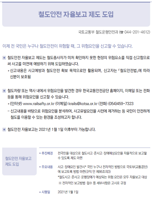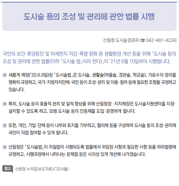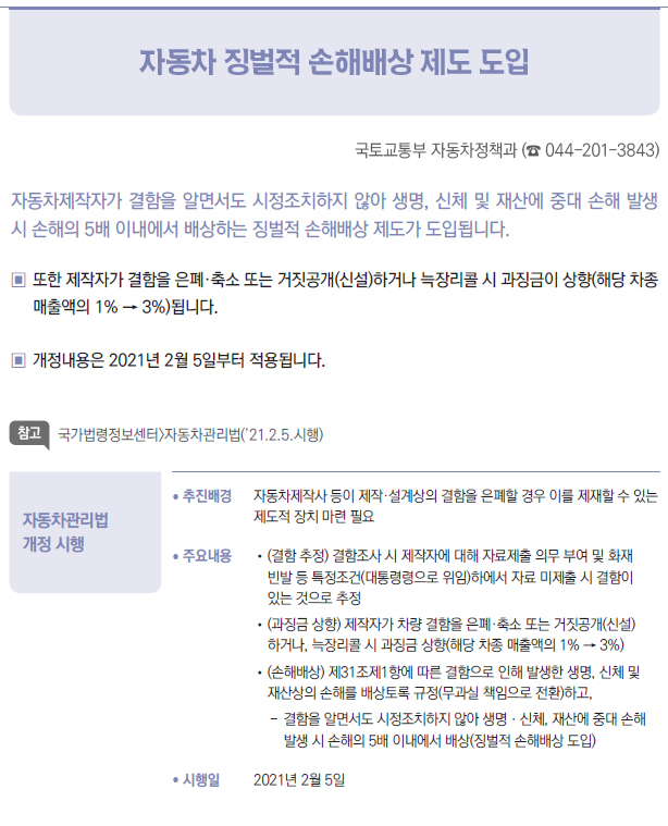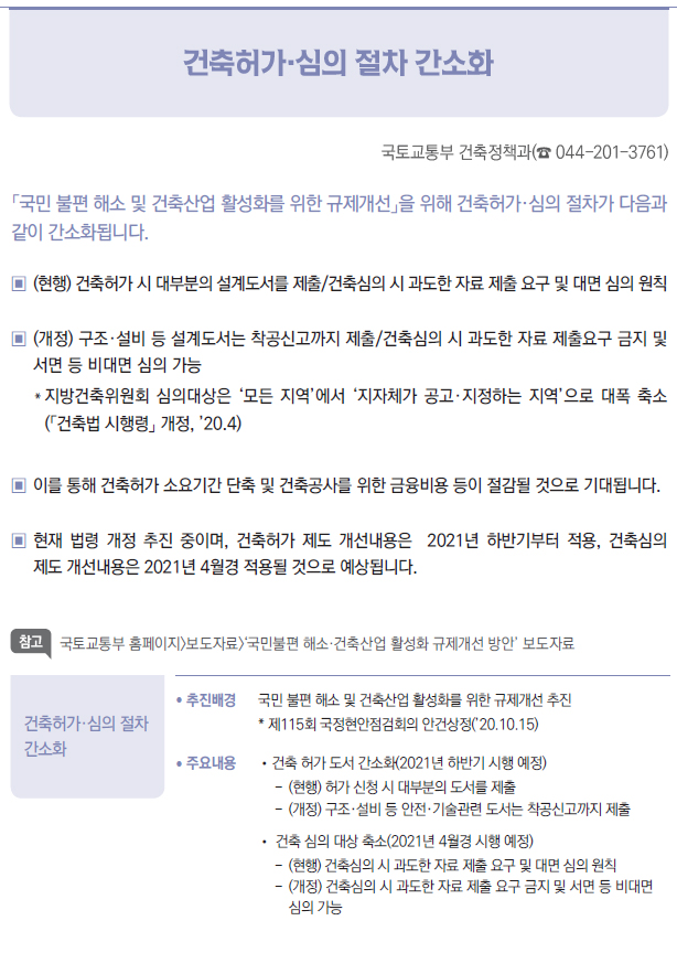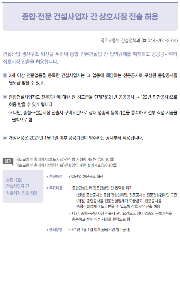 | [2021년부터 달라지는 것] ⑩ 국토·교통 - 종합·전문 건설사업자 간 상호시장 진출 허용 - 건축허가·심의 절차 간소화 - 철도안전 자율보고 제도 도입 - 자동차 징벌적 손해배상 제도 도입 - 도시숲 등의 조성 및 관리에 관한 법률 시행 |