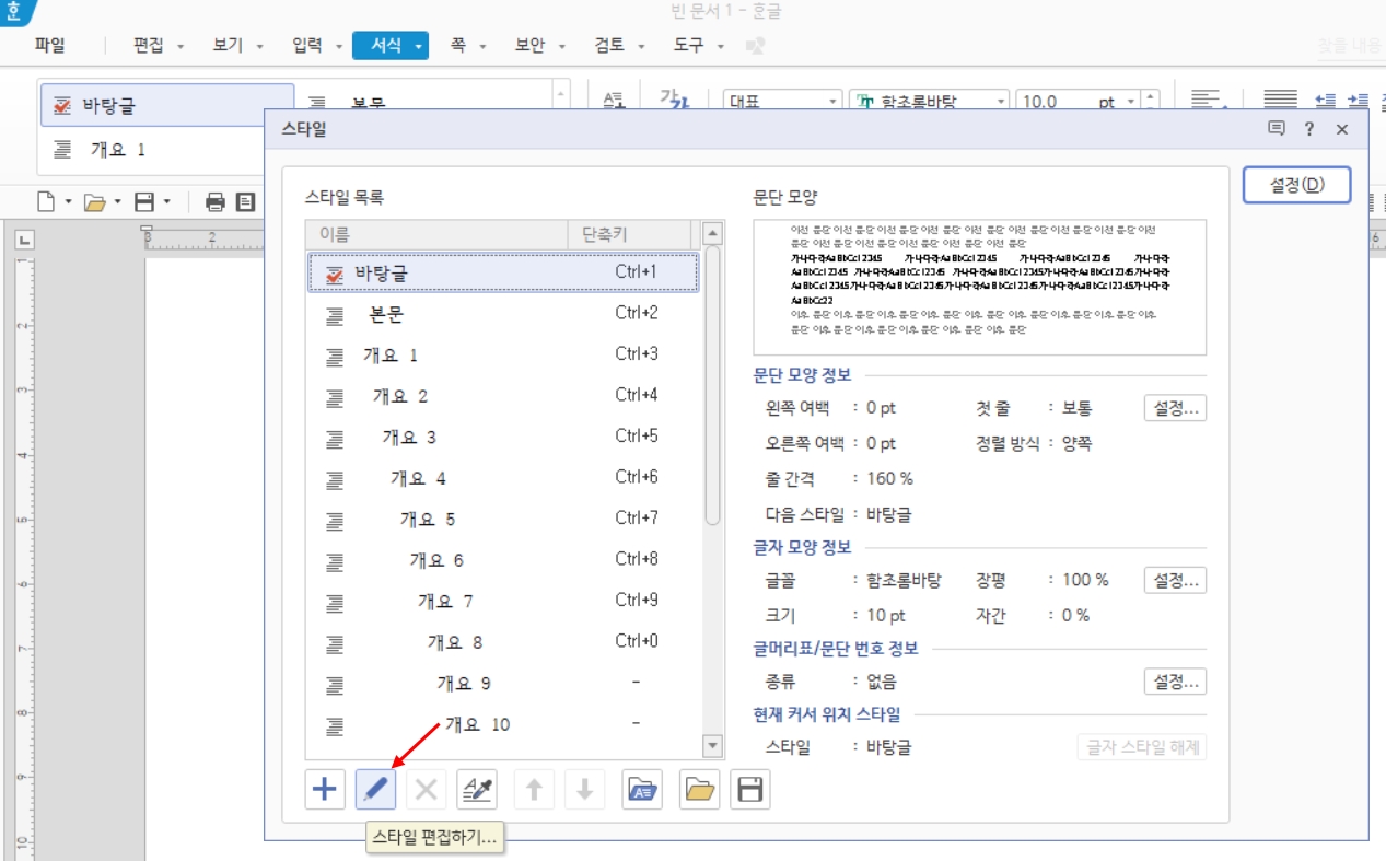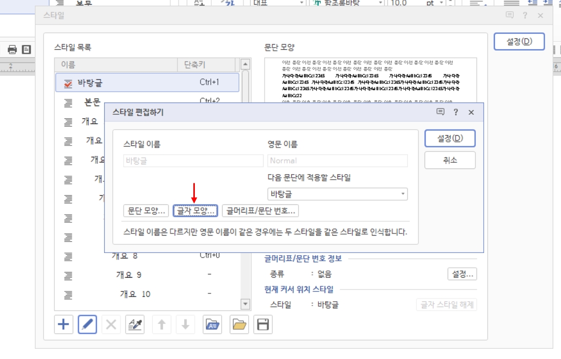 '글자 모양' 창 설정(D) 클릭 후 '스타일 편집하기' 설정(D) 을 클릭해 주고 나면 '스타일' 창이 남아 있습니다.