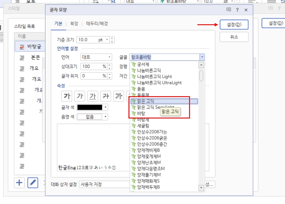 '글자 모양' 창이 활성화 되었습니다. 기준크기, 언어, 상대크기, 글자 위치, 글꼴, 장평, 자간, 속성 등을 변경할 수 있습니다. 기본 글꼴을 함초롱바탕에서 맑은고딕으로 변경하려고 하니 맑은 고딕 선택 후 설정(D) 를 클릭합니다.