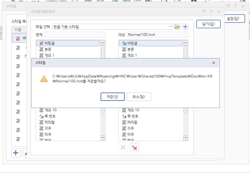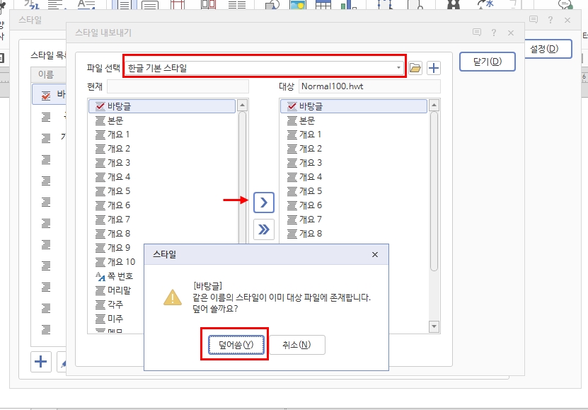 [바탕글] 같은 이름의 스타일이 이미 대상 파일에 존재합니다. 덮어 쓸까요? 를 묻는 창이 뜨고 덮어씀(Y) 를 클릭 합니다.