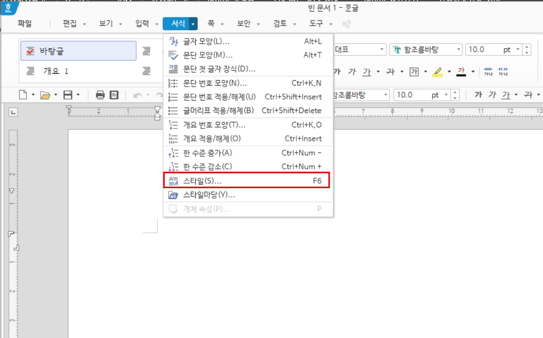 상단 메뉴 중 '서식' - '스타일(S)... F6' 을 클릭합니다.