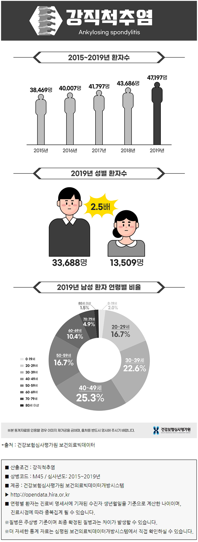 건강보험심사평가원의 통계에 따르면 2019년 강직척추염으로 4만 7197명이 병원을 찾았는데요. 이 중 남성이 여성보다 약 2.5배 많은 3만 3688명이었습니다. 남성 환자는 40대에서 가장 많았으며(25.3%), 30대가 22.6%, 20대와 50대가 16.7%를 차지했습니다. 20대부터 50대까지 수진자가 고루 분포한 것을 보면, 사회활동을 하는 현대인에게 주로 나타나는 질병임을 알 수 있습니다.