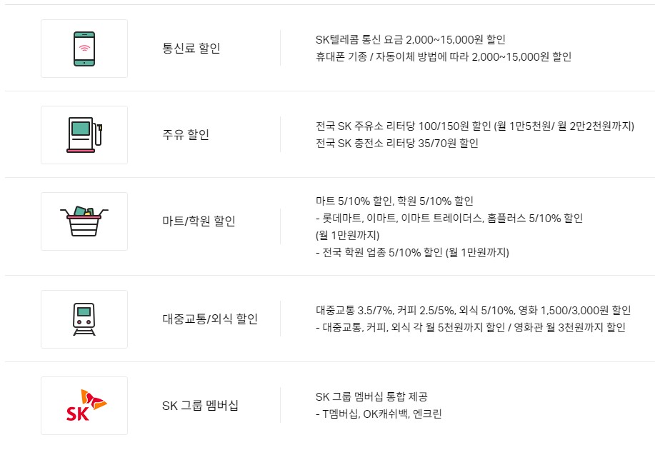 주요혜택 - 통신료 할인, 주유 할인, 마트/학원 할인, 대중교통/외식 할인, SK 그룹 멤버십(T멤버십, OK캐쉬백)