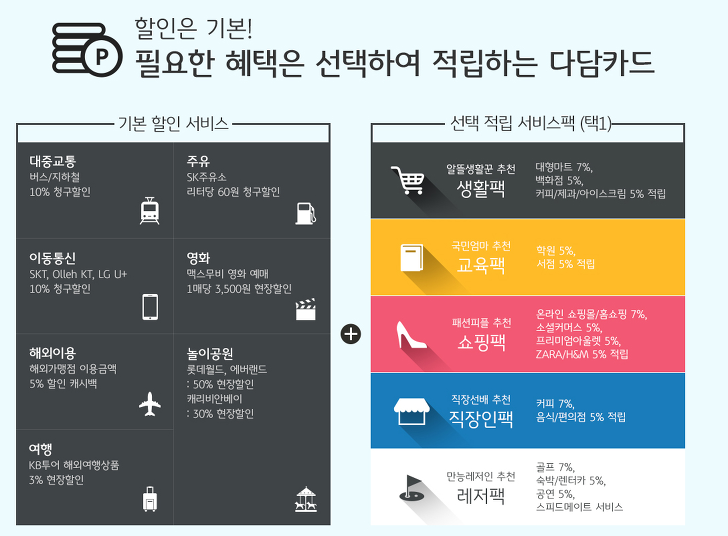 [다담카드(비 OTP)] 교통/통신/해외 5~10%, 생활/교육/쇼핑 5~7%, 연간리워드 1만5000P - KB 국민카드