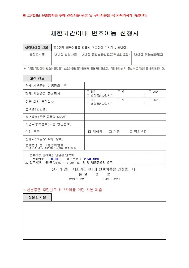 이동전화 제한기간이내 번호이동 신청서(첨부파일)
