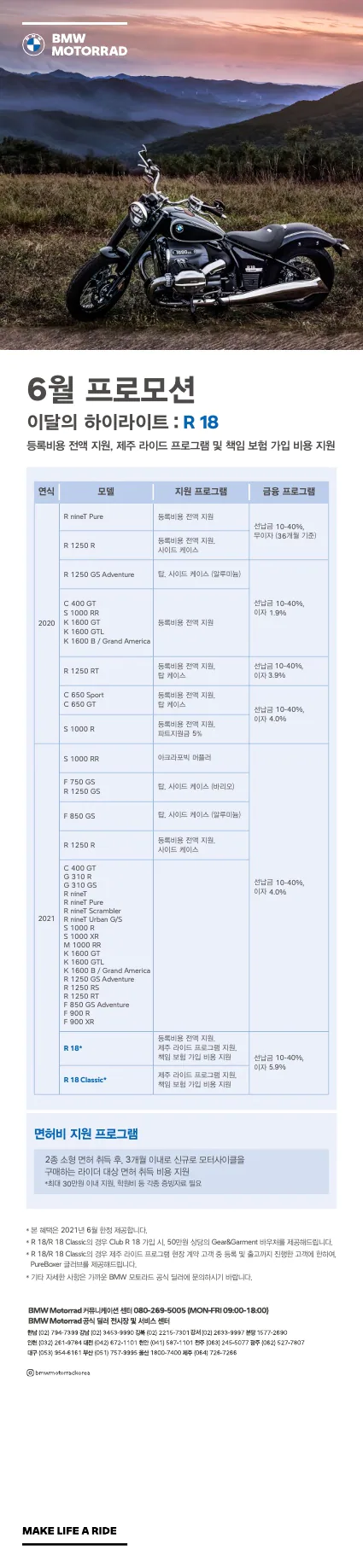 BMW R 18 등록비용 전액 지원, 제주 라이드 프로그램 및 책임 보험 가입 비용 지원