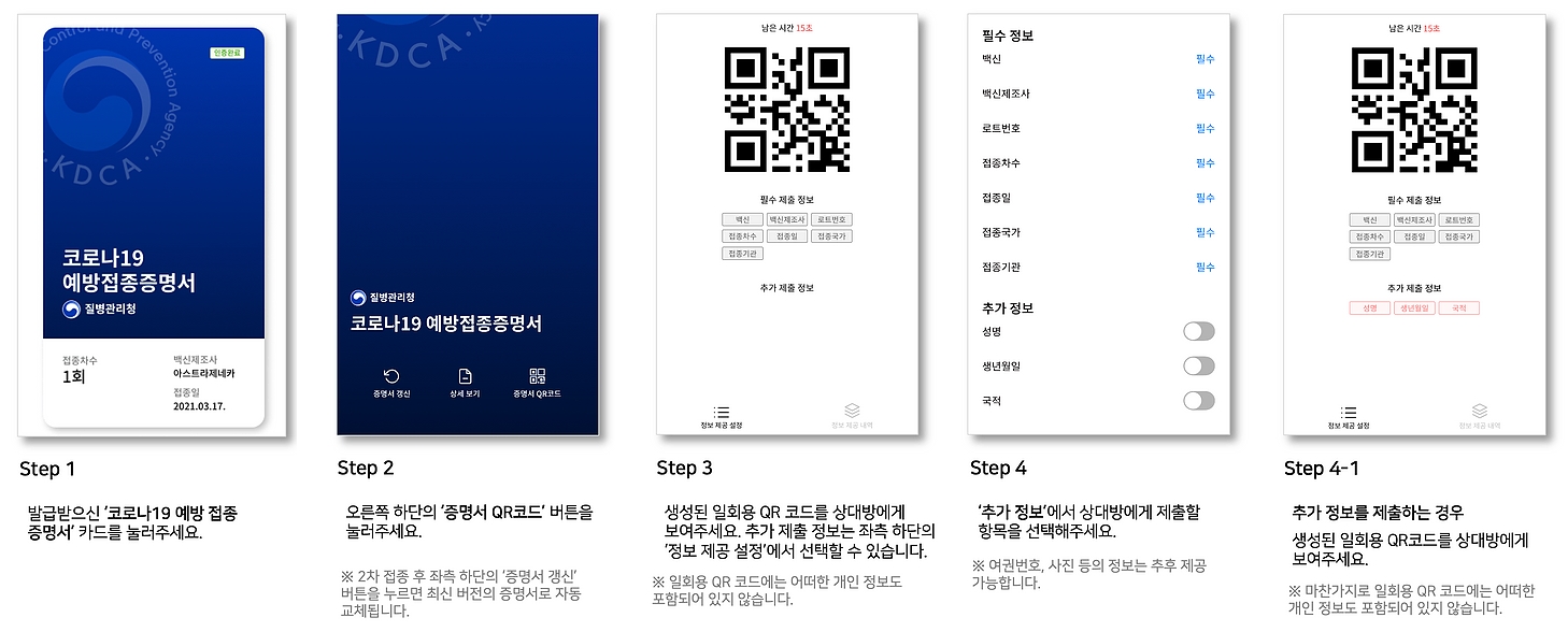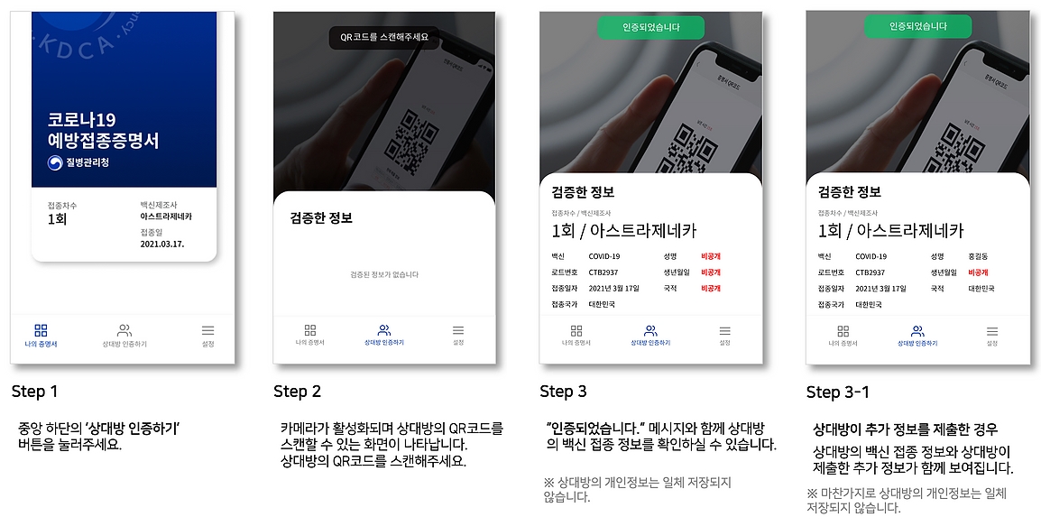 | 추가 정보 제공 기능을 통한 다양한 활용 | 자신의 선택에 따라 예방 접종 사실 이외의 다양한 추가 정보를 상대방에게 제공할 수가 있습니다.(이름, 생년월일, 국적, 여권번호, 사진 등) |