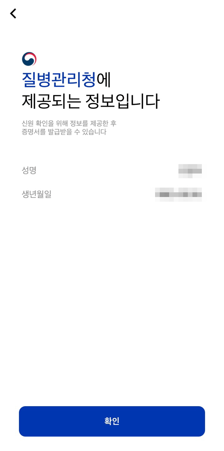 | 본인 인증 후 코로나19 예방접종증명서 '발급받기' 클릭 | 질병관리청 정보제공 | 질병관리청 데이터에 백신 접종 기록이 확인되는 경우 증명서 발급 완료 |
