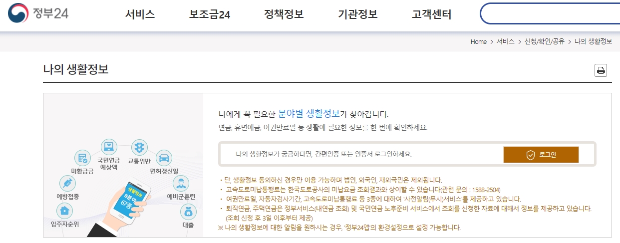 나의 생활정보 | 똑똑한 서비스 | 정부서비스 | 정부24